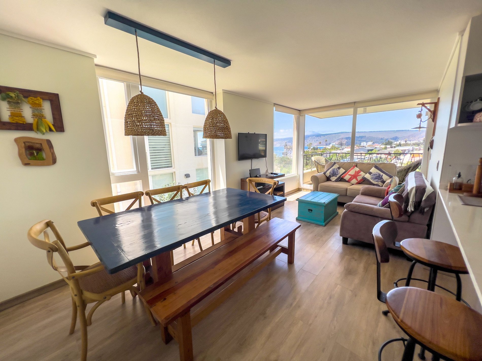 La terraza cuenta con 3 sillones de terraza, el living con dos sofás y la vista a Papudo y la playa se puede apreciar desde el living tal cual como se aprecia en las fotos. El dormitorio matrimonial cuenta con una vista directa a Papudo, es hermosa.