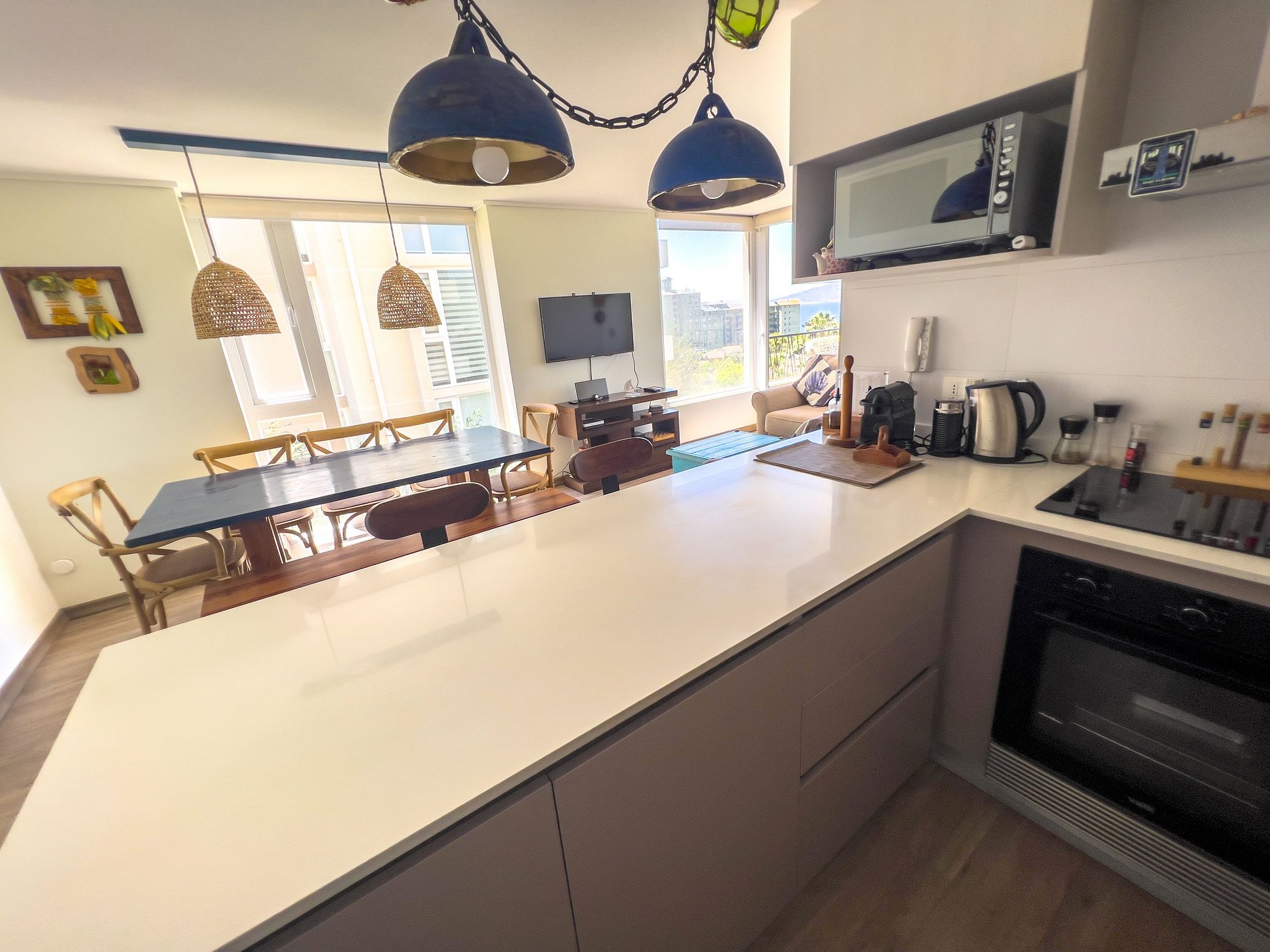 El living-comedor cuenta con suficientes sillas y sofás para disfrutar en conjunto durante las vacaciones. Su ubicación es muy buena quedando cerca del centro de Papudo y de la playa, sin embargo está alejado del ruido de la plaza central.