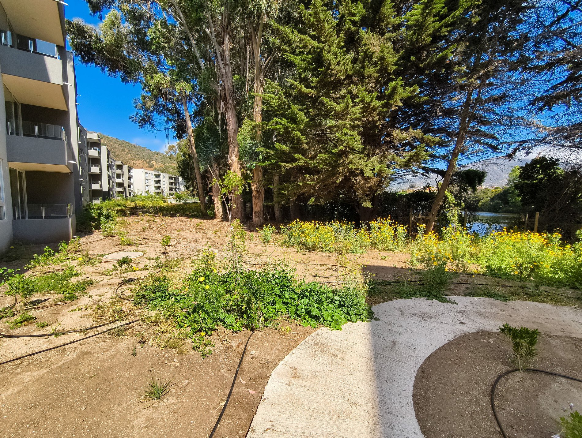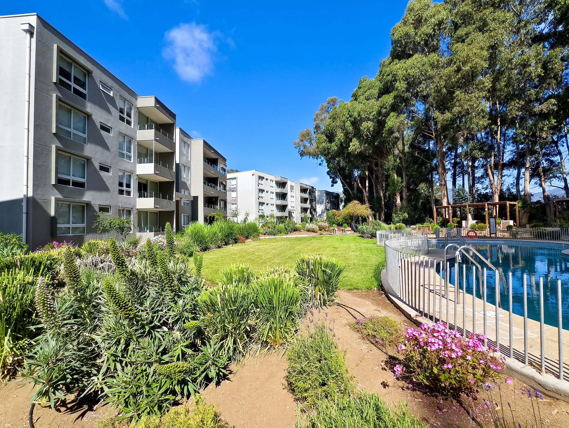 En un departamento ubicado en un condominio muy grande, con muchos edificios y grandes espacios comunes, con un amplio jardín.