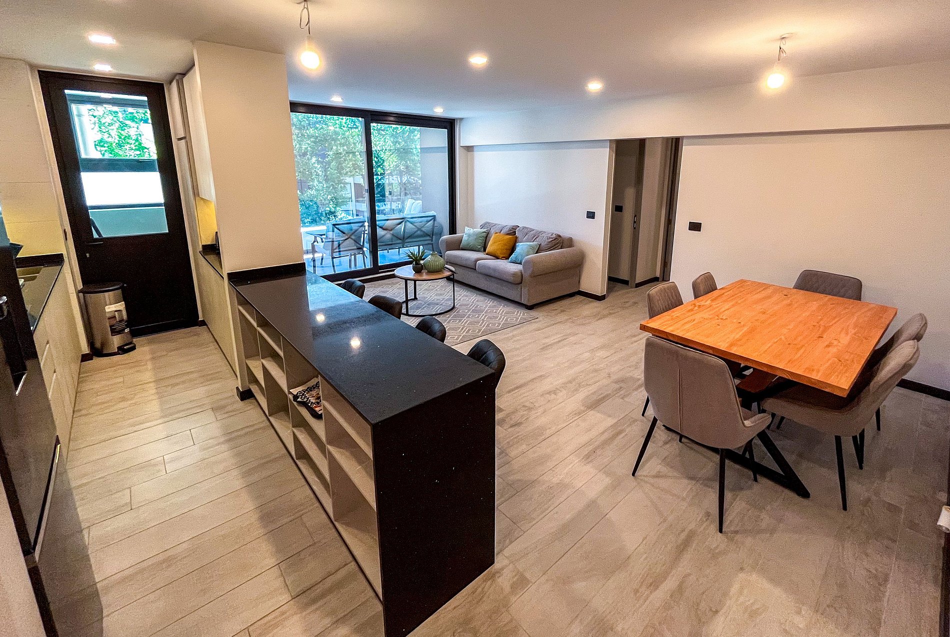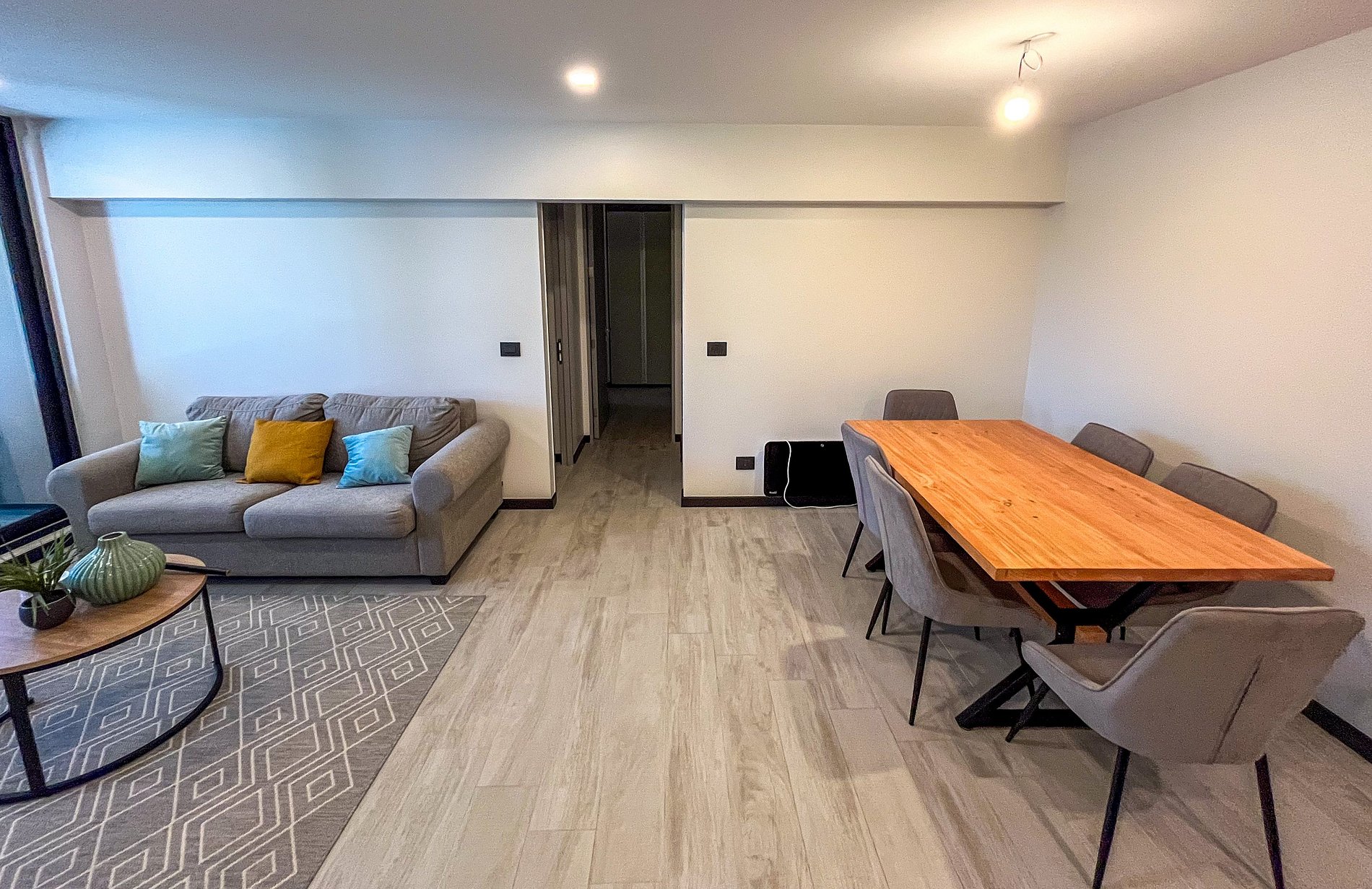 Departamento exclusivo y muy moderno a 6 minutos en auto del centro de Pucón. Perfecto para cinco huéspedes. Cuenta con dos baños y dos dormitorios. El condominio cuenta con piscina, zona de juegos y un amplio parque privado. La terraza tiene vista al jardín interior.
