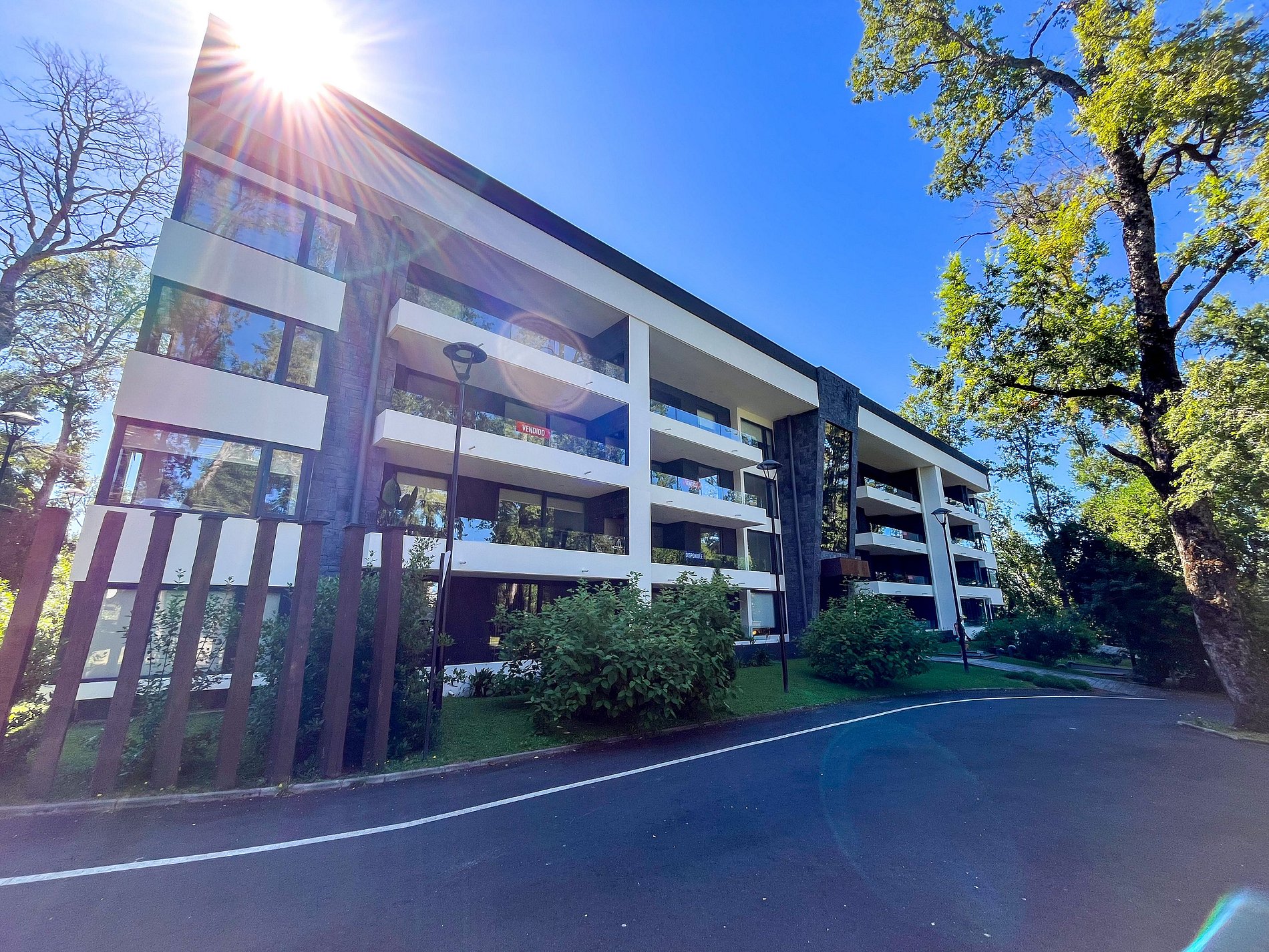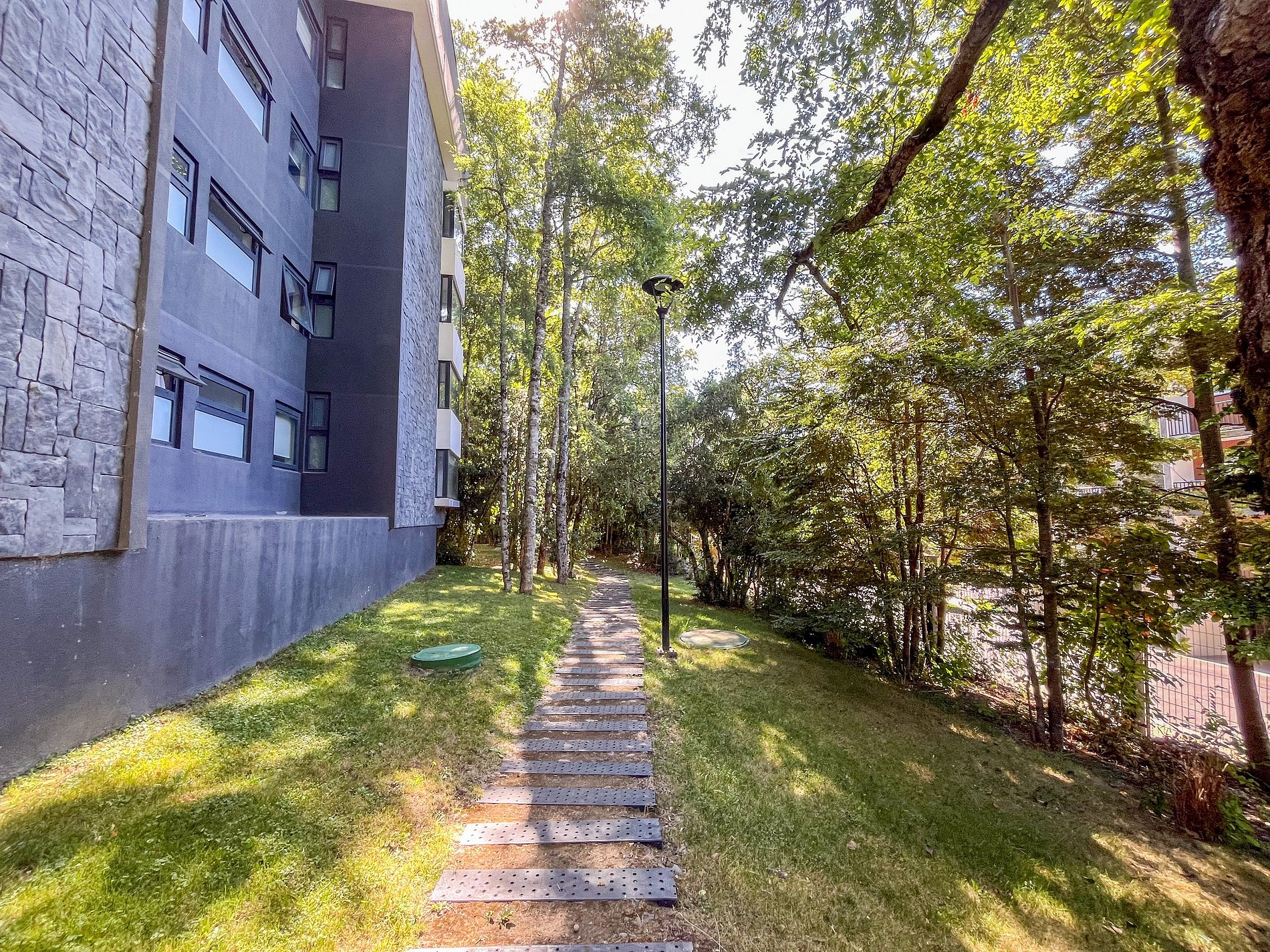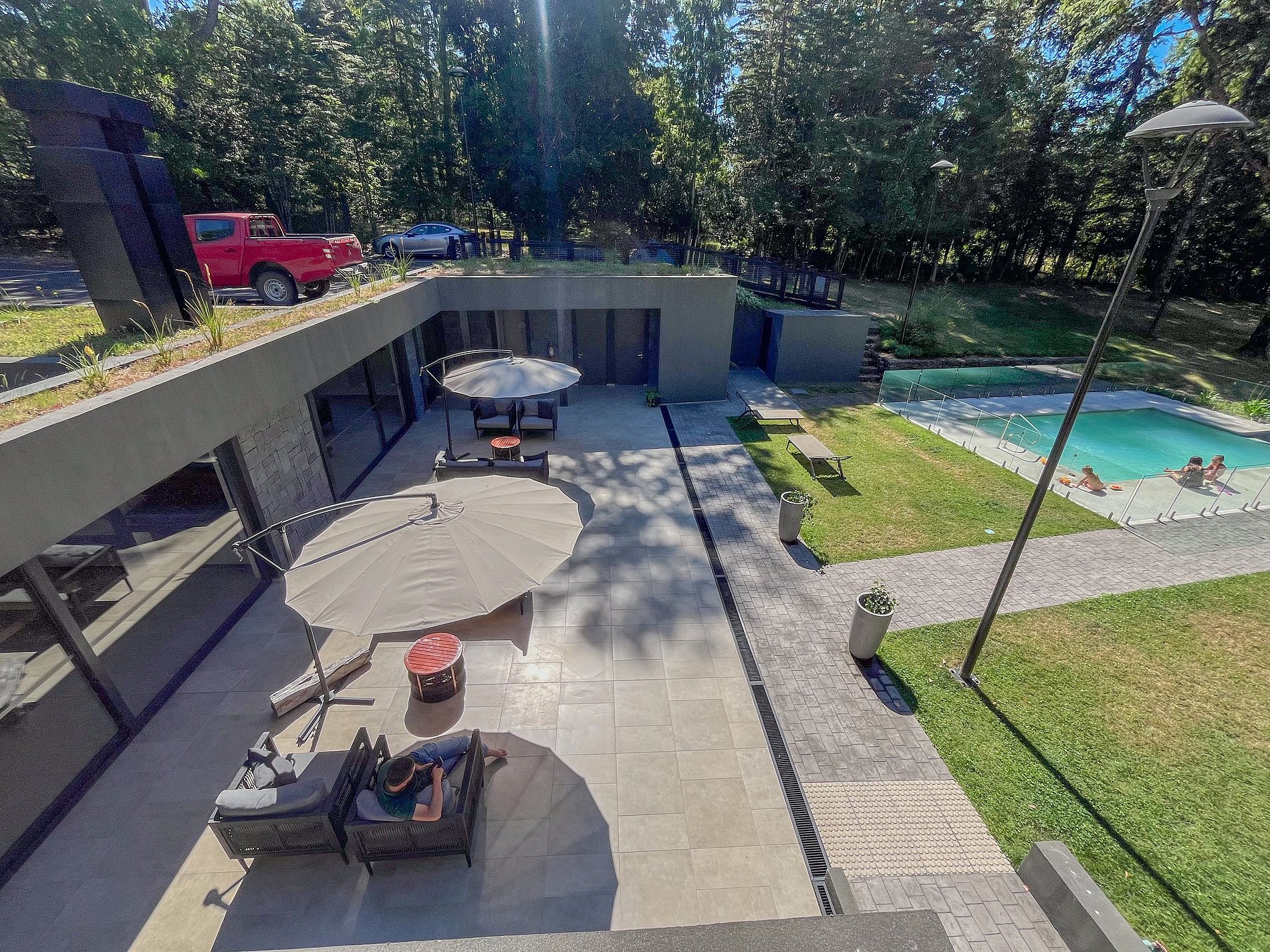 Además, el edificio está rodeado por bosques, lo que le da un ambiente muy tranquilo y natural, perfecto para el descanso. Hay una caminata a través del parque privado del edificio que se puede hacer desde la piscina hacia el interior del bosque que te permitirá conectar con la naturaleza a través de las impresionantes vistas al bosque. Se recomienda el uso de vehículo para ir al centro de la ciudad. Aquí podrás descansar, hacer deporte y disfrutar de la naturaleza del sur de Chile.