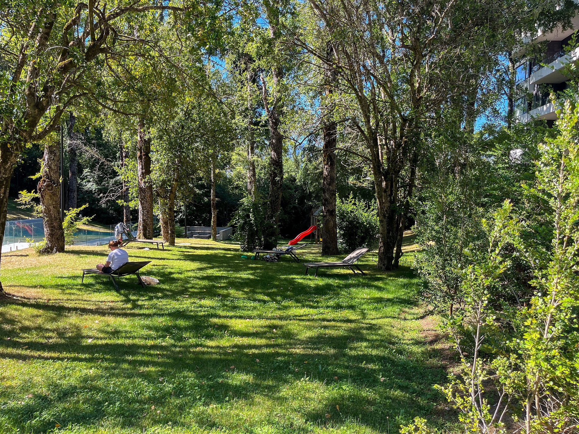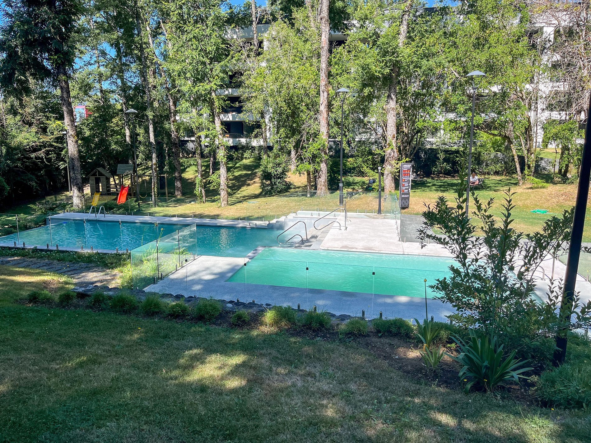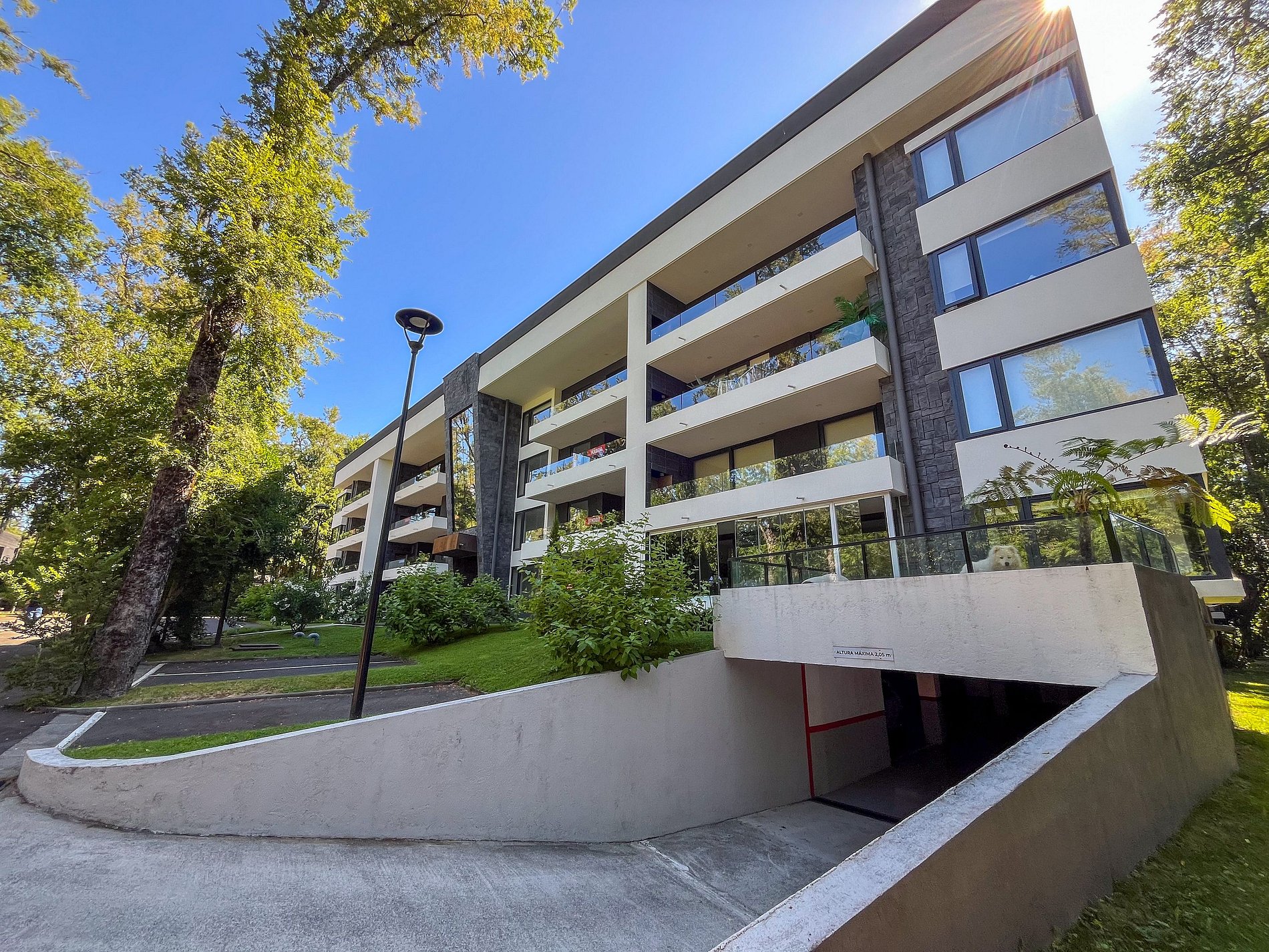 Además, el edificio está rodeado por bosques, lo que le da un ambiente muy tranquilo y natural, perfecto para el descanso. Hay una caminata a través del parque privado del edificio que se puede hacer desde la piscina hacia el interior del bosque que te permitirá conectar con la naturaleza a través de las impresionantes vistas al bosque. Se recomienda el uso de vehículo para ir al centro de la ciudad. Aquí podrás descansar, hacer deporte y disfrutar de la naturaleza del sur de Chile.