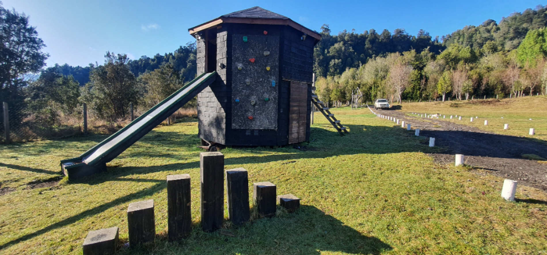 En su exterior la propiedad cuenta con amplia terraza además de hermosos jardines, vegetación de la zona y atracciones como: pared de escalar para niños, columpios, tirolesa y otros.