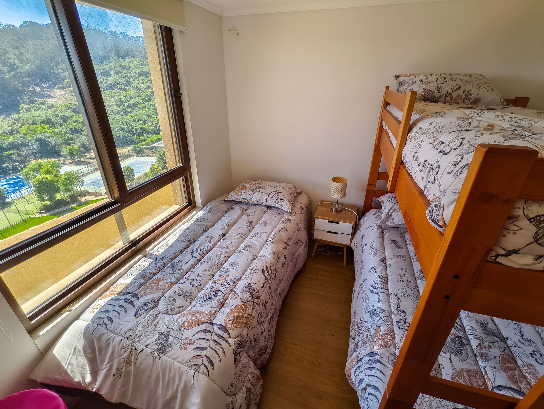 El departamento posee mitad de vista hacia el mar en segunda línea y hacia el bosque aledaño al condominio.