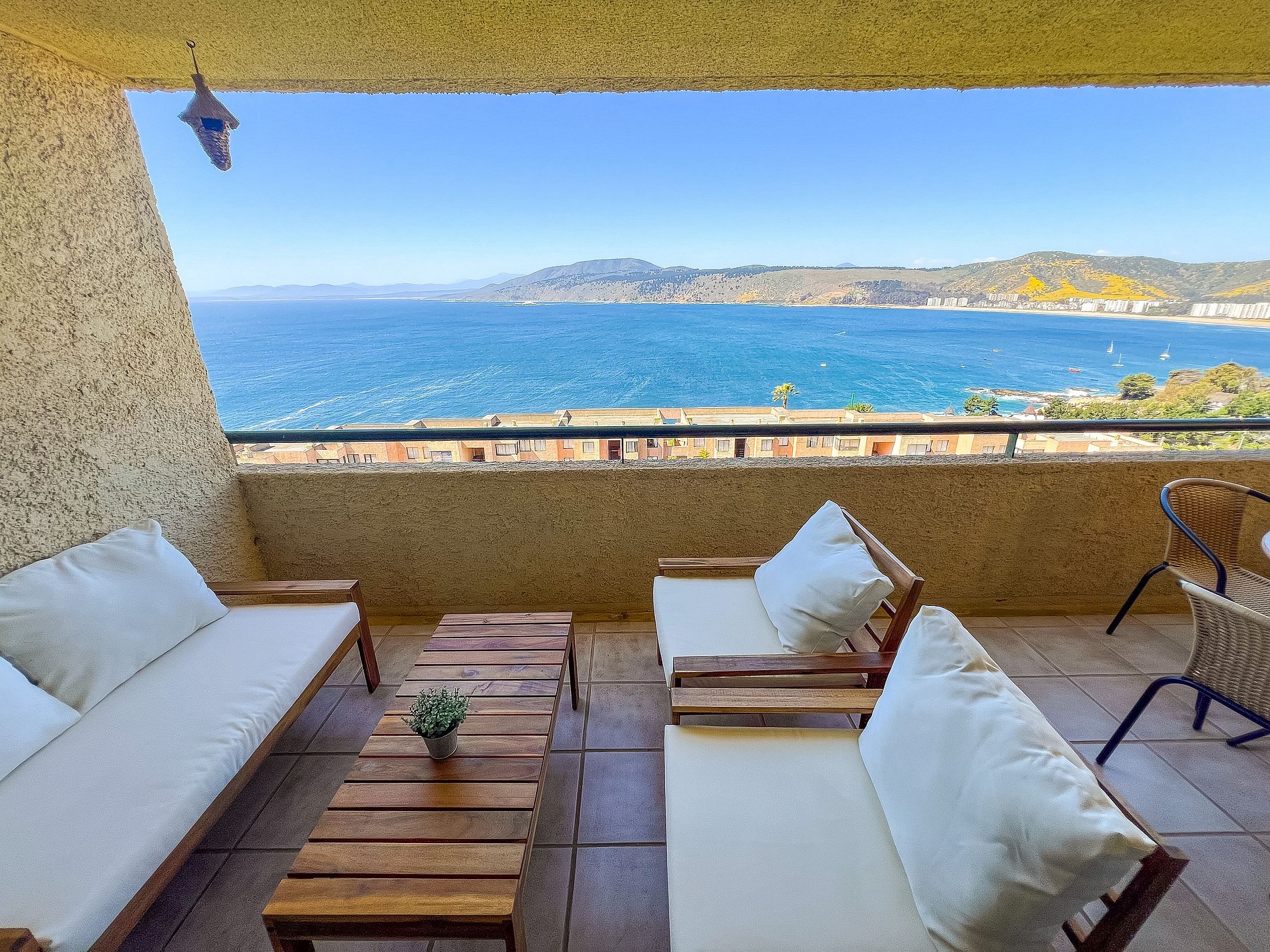 Departamento con una vista increíble al mar a solo dos minutos en auto de la playa más cercana. Perfecto para cinco huéspedes. Cuenta con dos habitaciones y dos baños. El edificio tiene acceso a un amplio y espectacular jardín con caminos, árboles y excelentes vistas. Cuenta con piscina, quinchos, canchas de babyfútbol, básquetbol y pádle. La terraza del departamento tiene una excelente vista al mar.