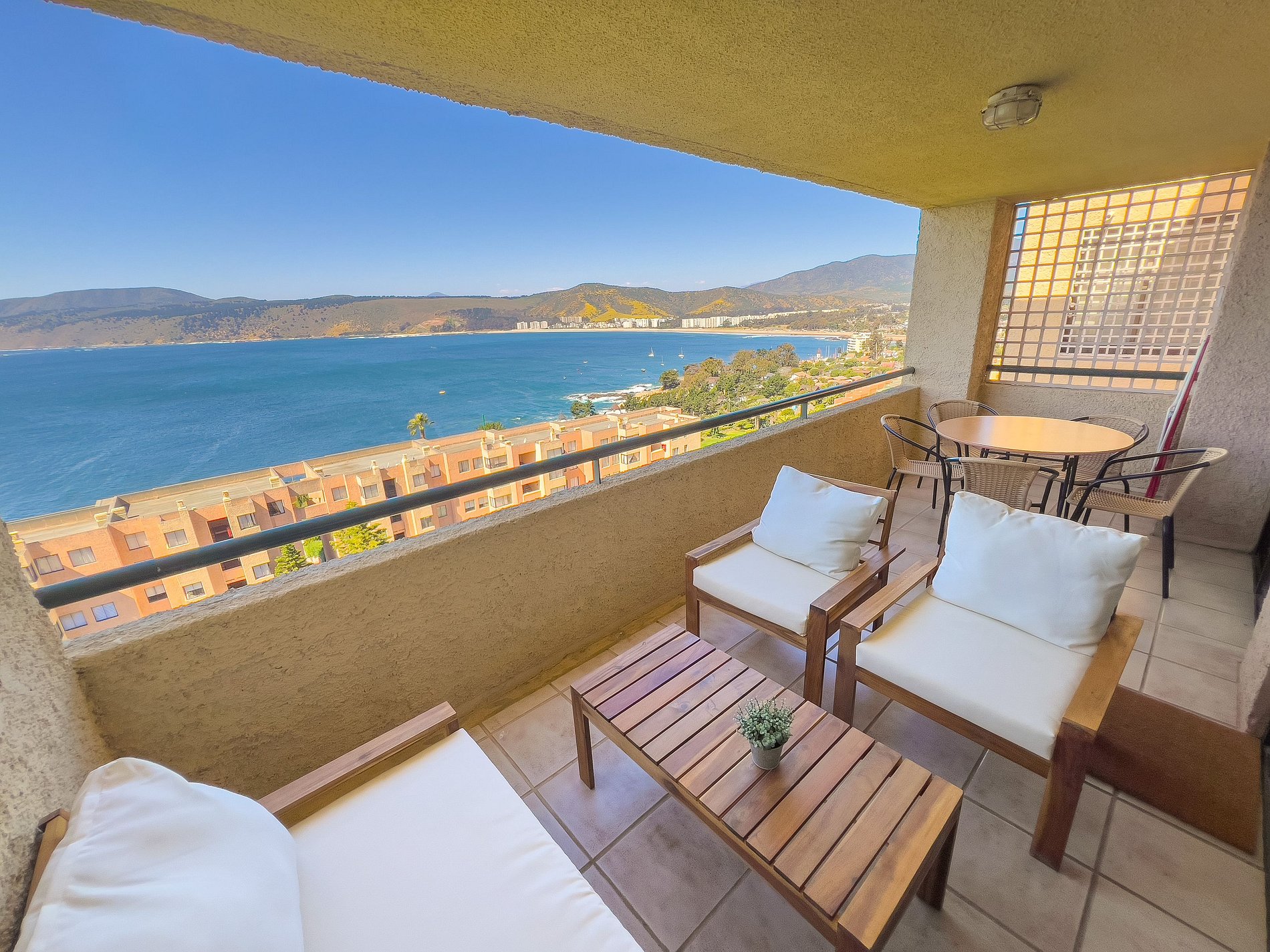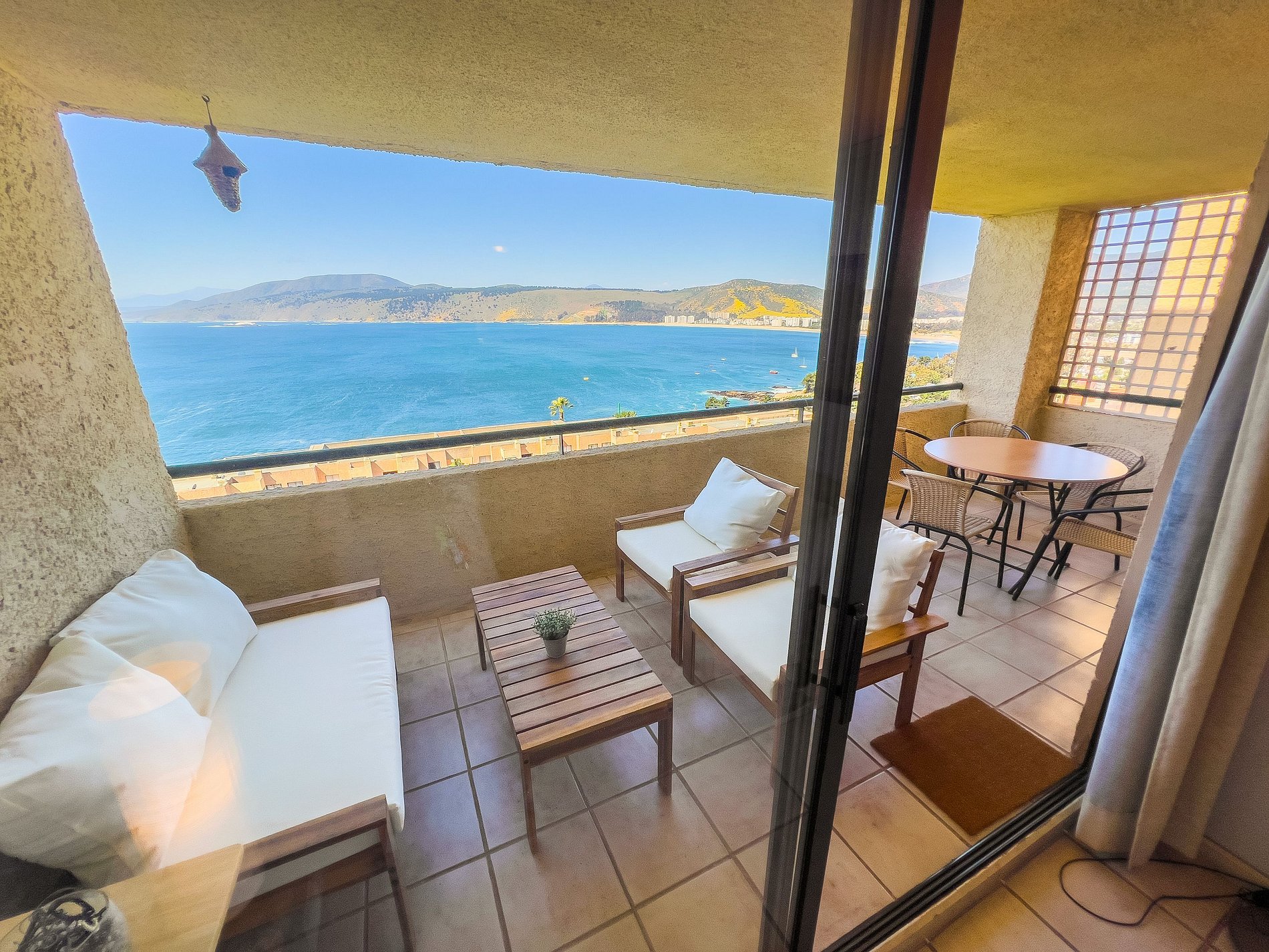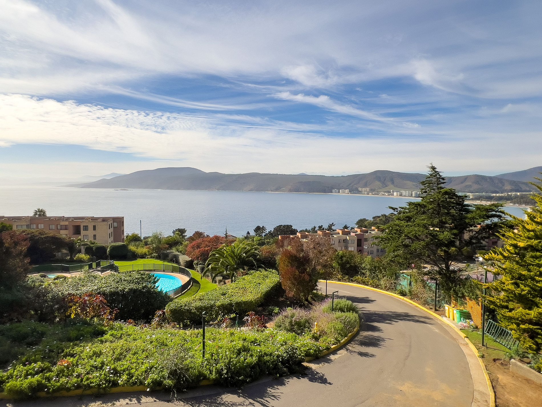 Departamento con una vista increíble al mar a solo dos minutos en auto de la playa más cercana. Perfecto para cinco huéspedes. Cuenta con dos habitaciones y dos baños. El edificio tiene acceso a un amplio y espectacular jardín con caminos, árboles y excelentes vistas. Cuenta con piscina, quinchos, canchas de babyfútbol, básquetbol y pádle. La terraza del departamento tiene una excelente vista al mar.