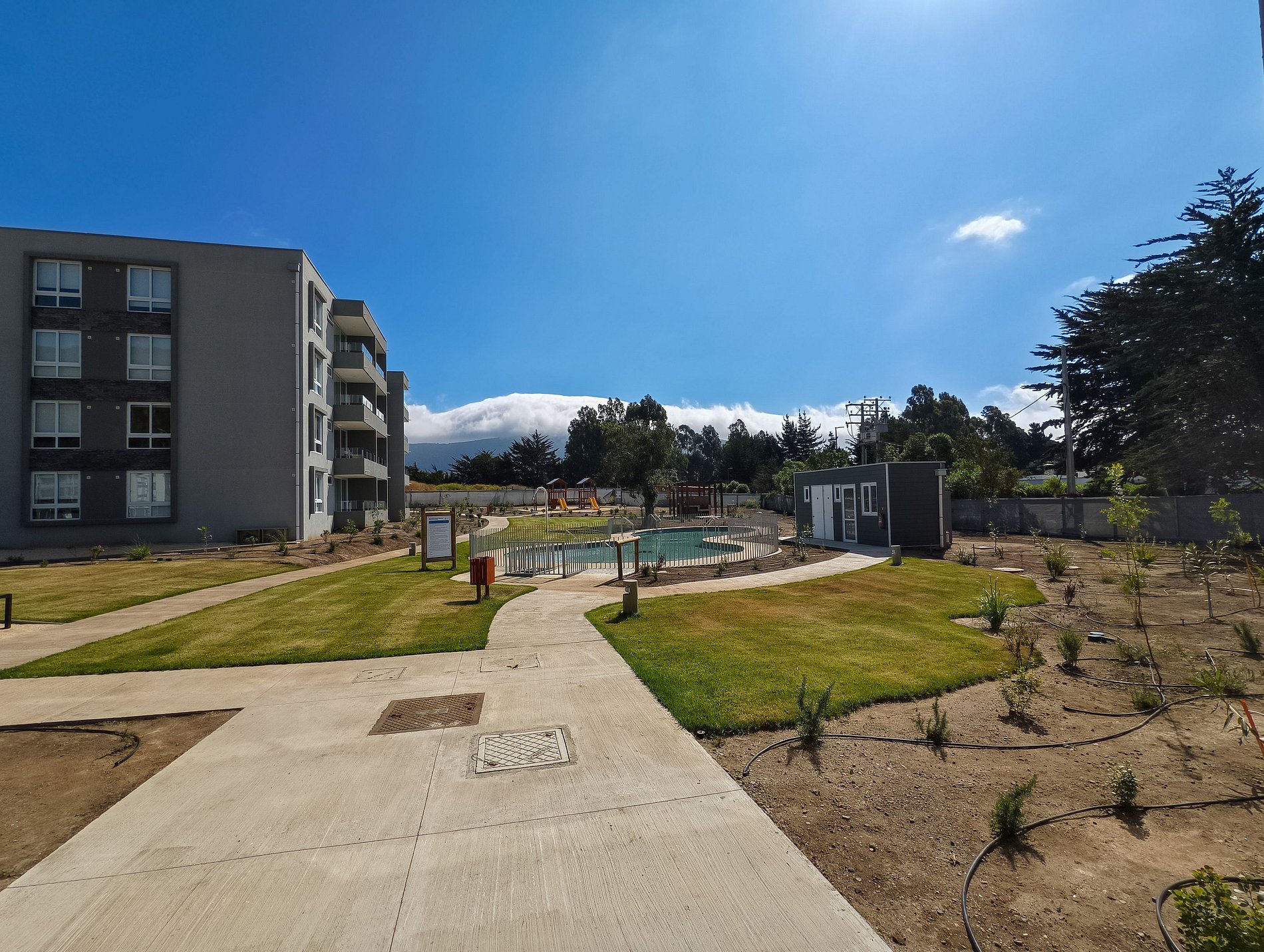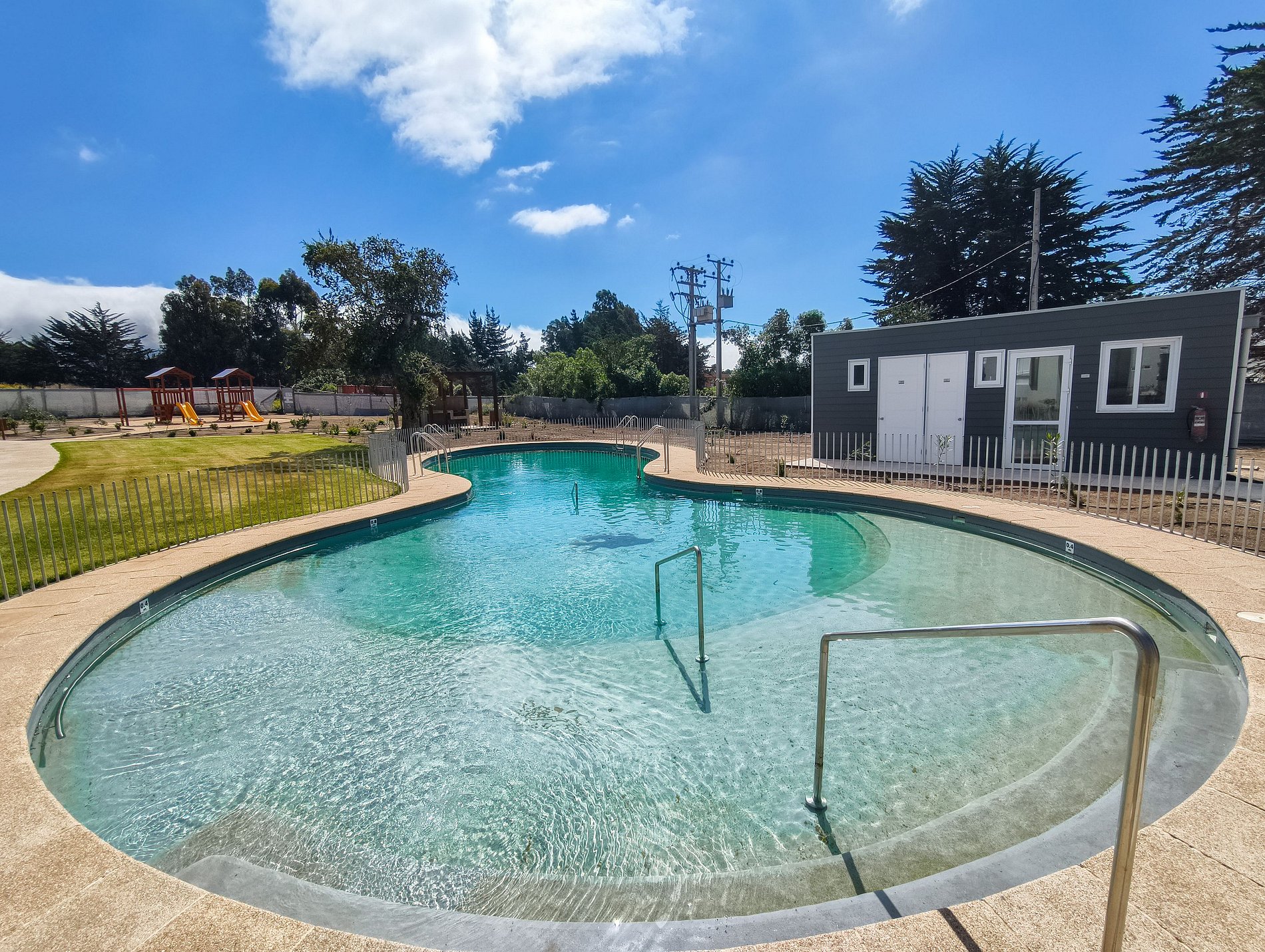 Espacios comunes: jardín, quincho, piscina (abierta en temporada de verano) y vistas al cerro, río y humedal.
