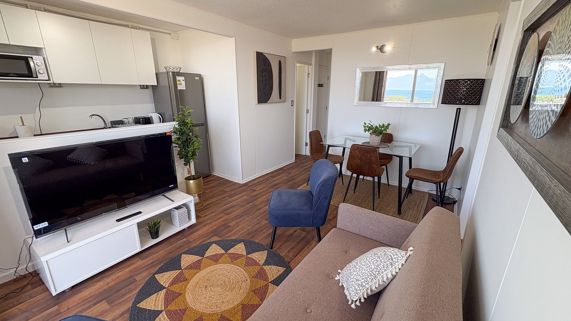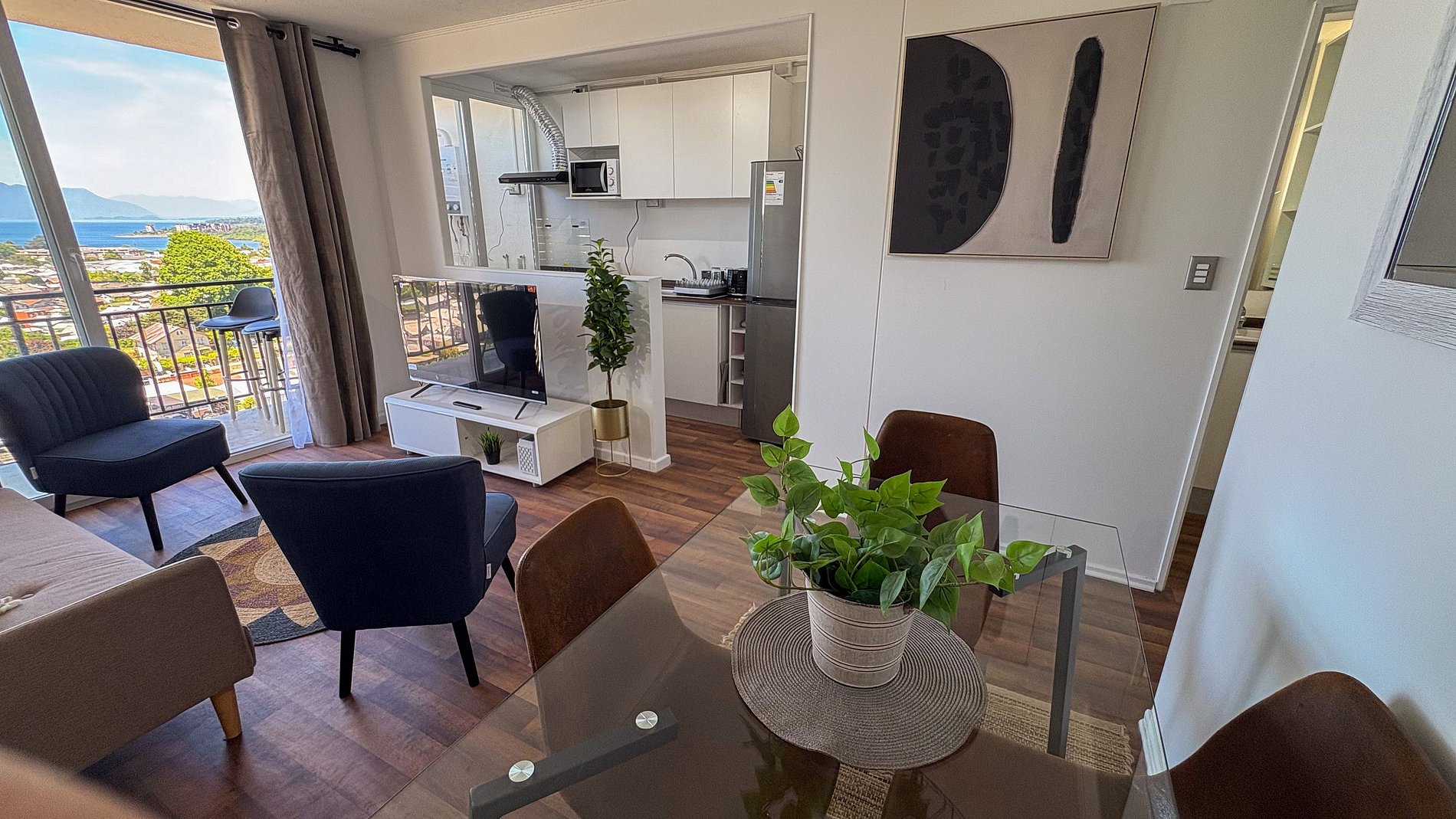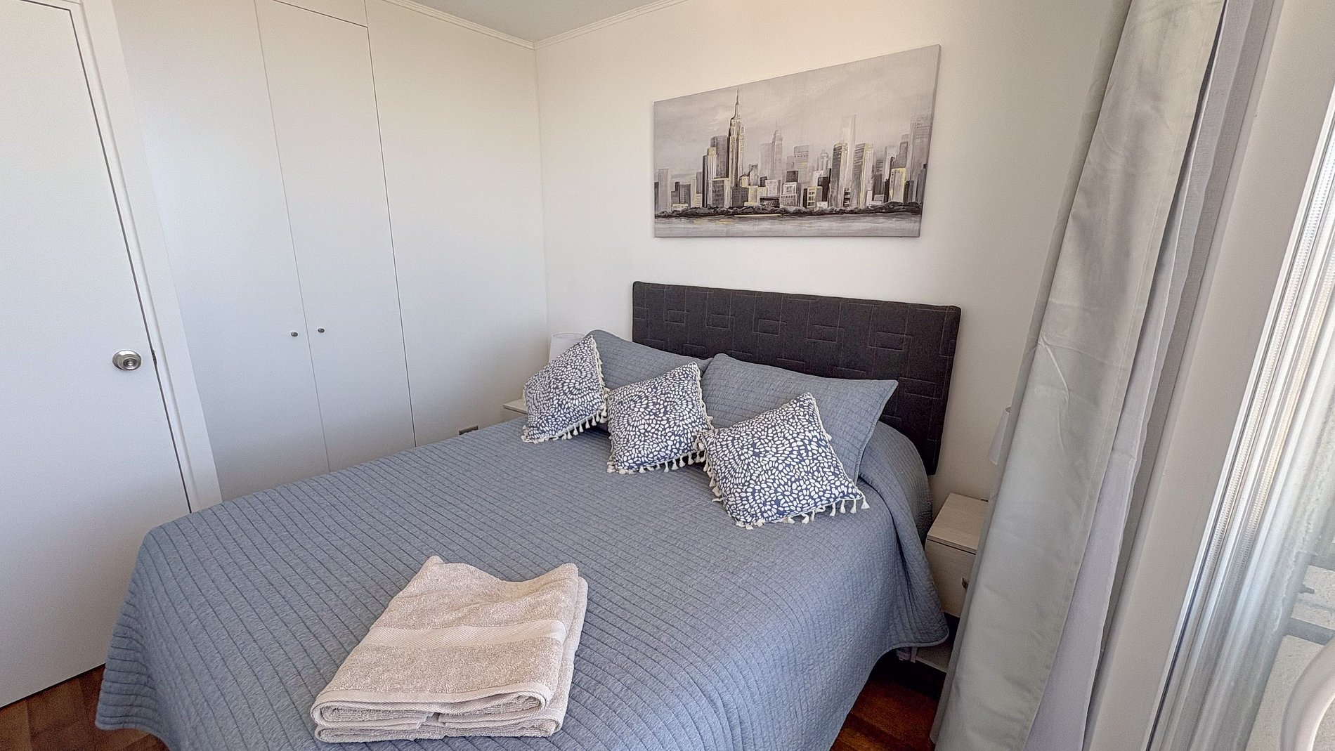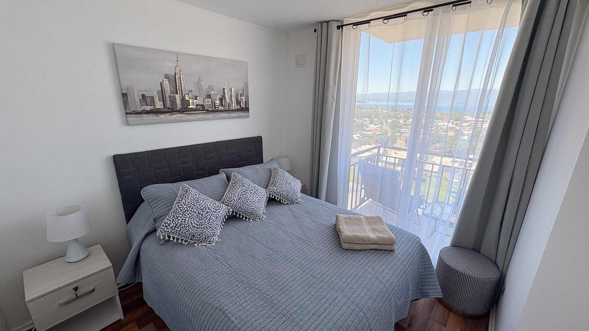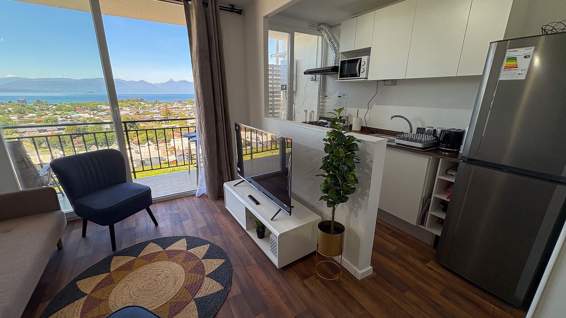Departamento nuevo, decorado para 6 personas, con 3 habitaciones y 1 baño, living-comedor y una cocina. Posee una pequeña terraza. Tiene excelentes vista panorámicas a Villarrica, el lago y vista a volcanes LLaima y Villarrica, tal como en las fotos. Posee 1 estacionamiento.