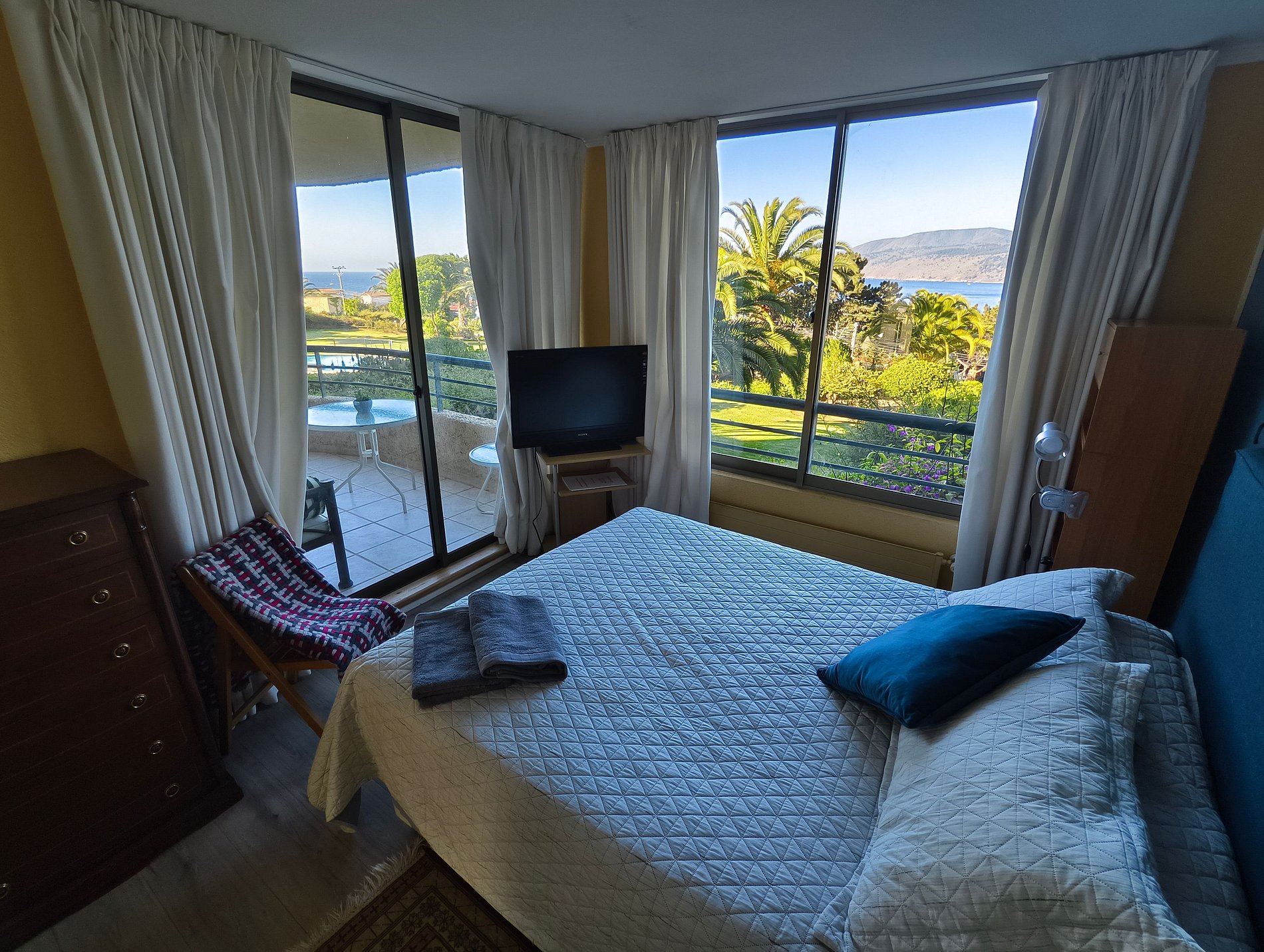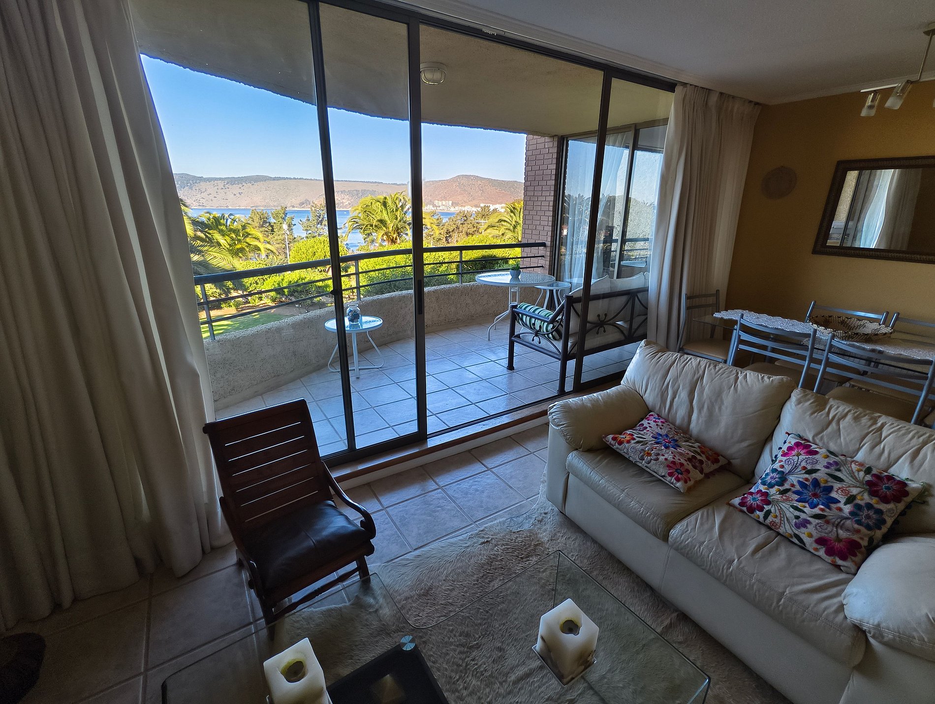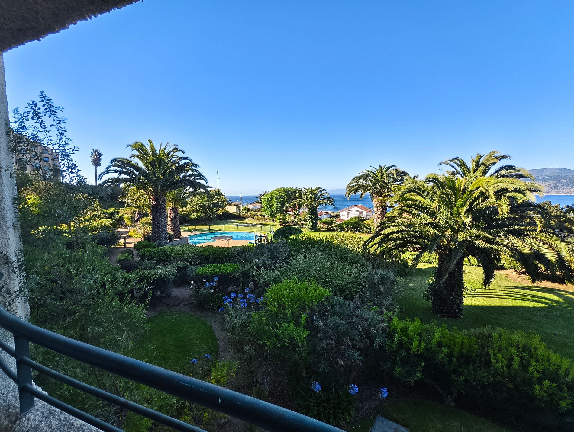 Departamento con una vista increíble al mar a solo dos minutos en auto de la playa más cercana. Perfecto para seis huéspedes. Cuenta con tres habitaciones y dos baños. El edificio tiene acceso a un amplio jardín, muy verde y muy bien diseñado, con caminos, árboles, excelentes vistas además de quinchos, piscina y piscina para niños. La terraza del departamento tiene vista al mar y al jardín. Está a 4 minutos de la playa chica de Papudo, accediendo por la ruta E 30-F en auto.