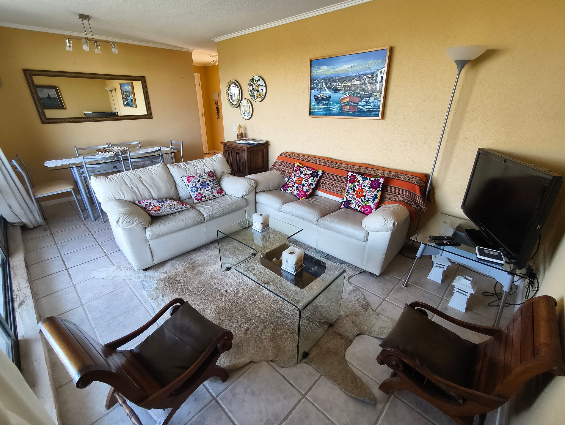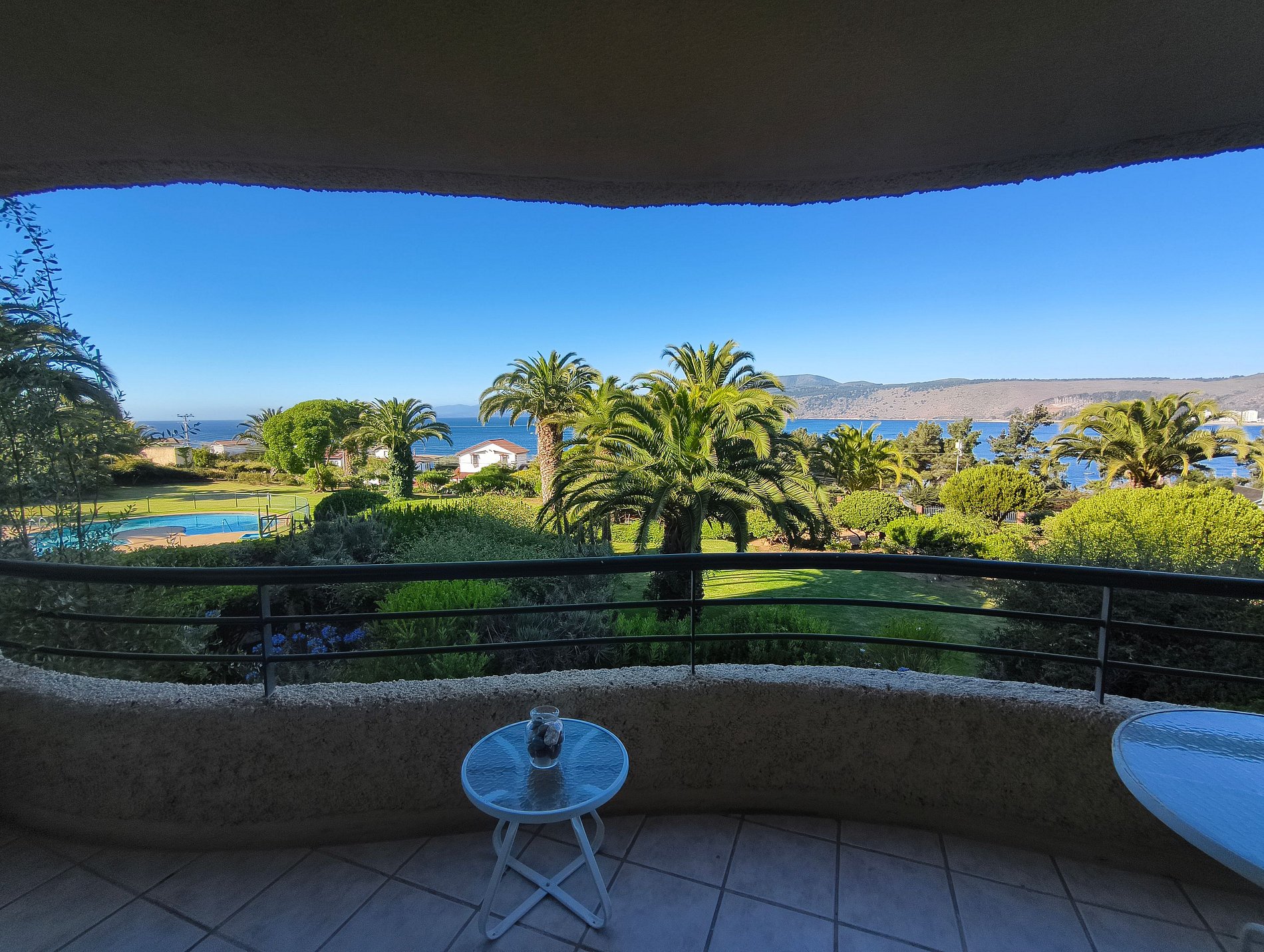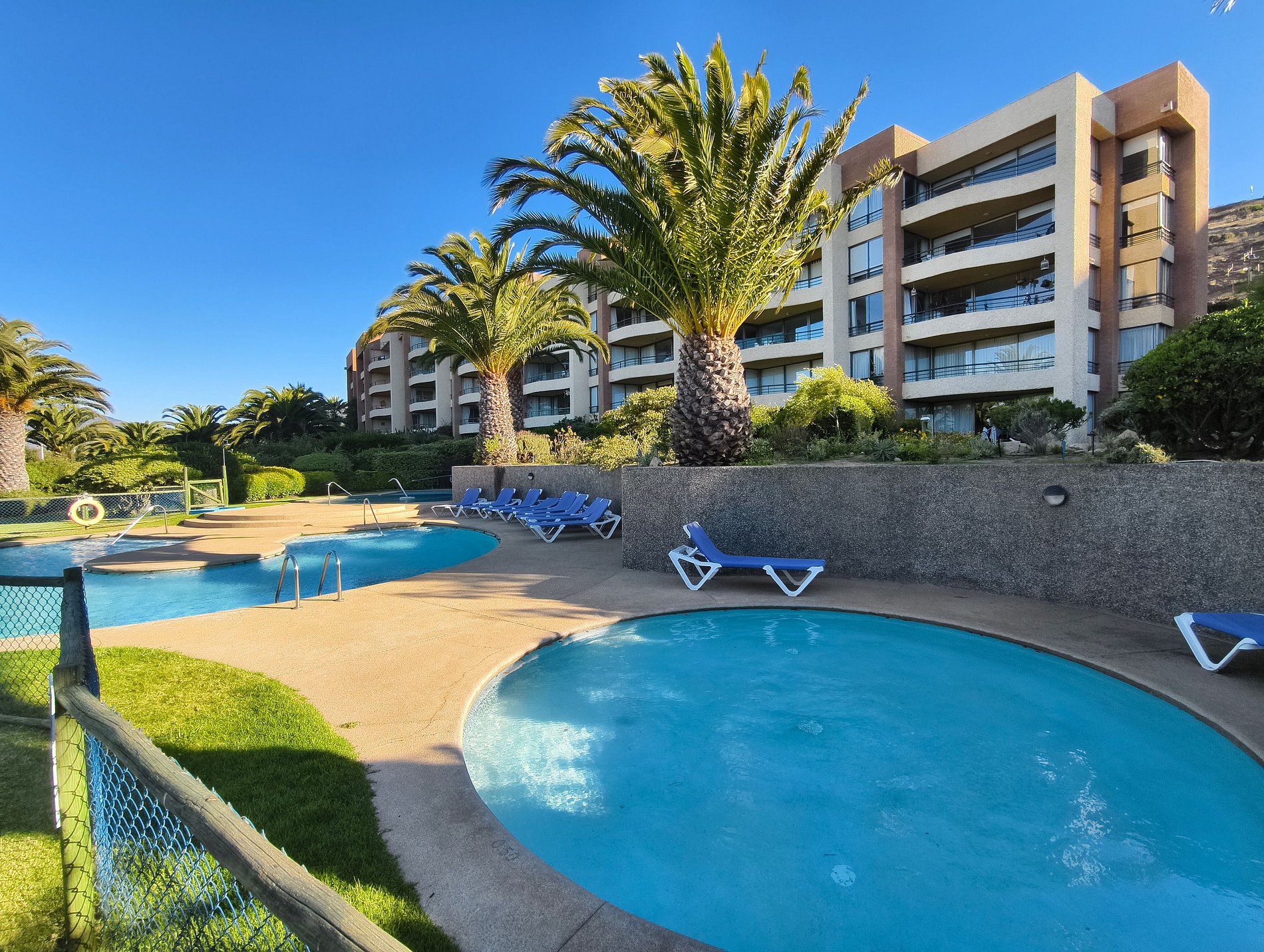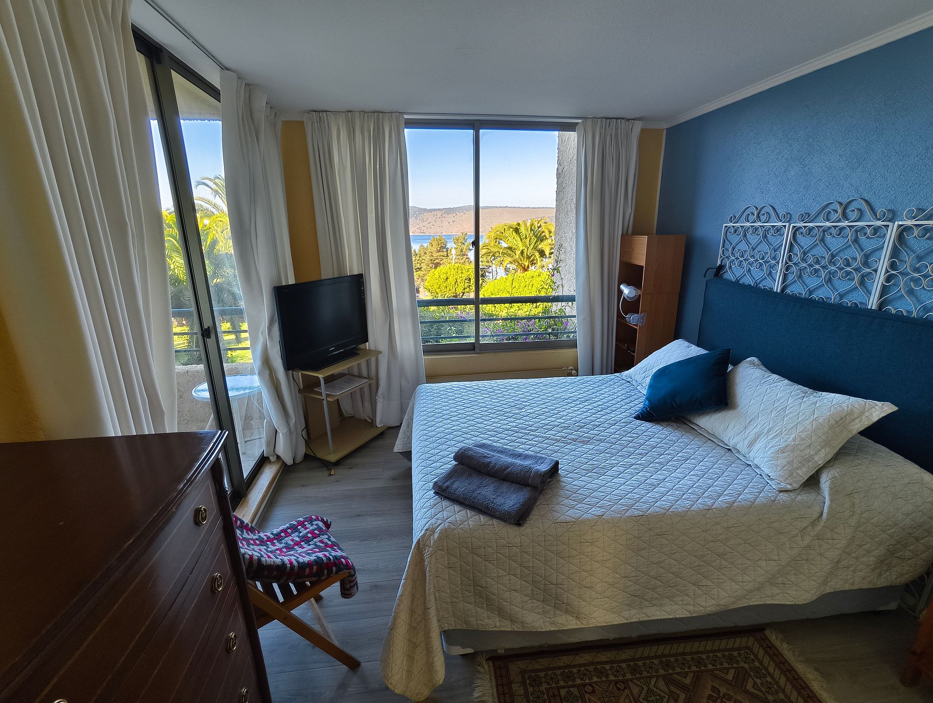 Departamento con una vista increíble al mar a solo dos minutos en auto de la playa más cercana. Perfecto para seis huéspedes. Cuenta con tres habitaciones y dos baños. El edificio tiene acceso a un amplio jardín, muy verde y muy bien diseñado, con caminos, árboles, excelentes vistas además de quinchos, piscina y piscina para niños. La terraza del departamento tiene vista al mar y al jardín. Está a 4 minutos de la playa chica de Papudo, accediendo por la ruta E 30-F en auto.