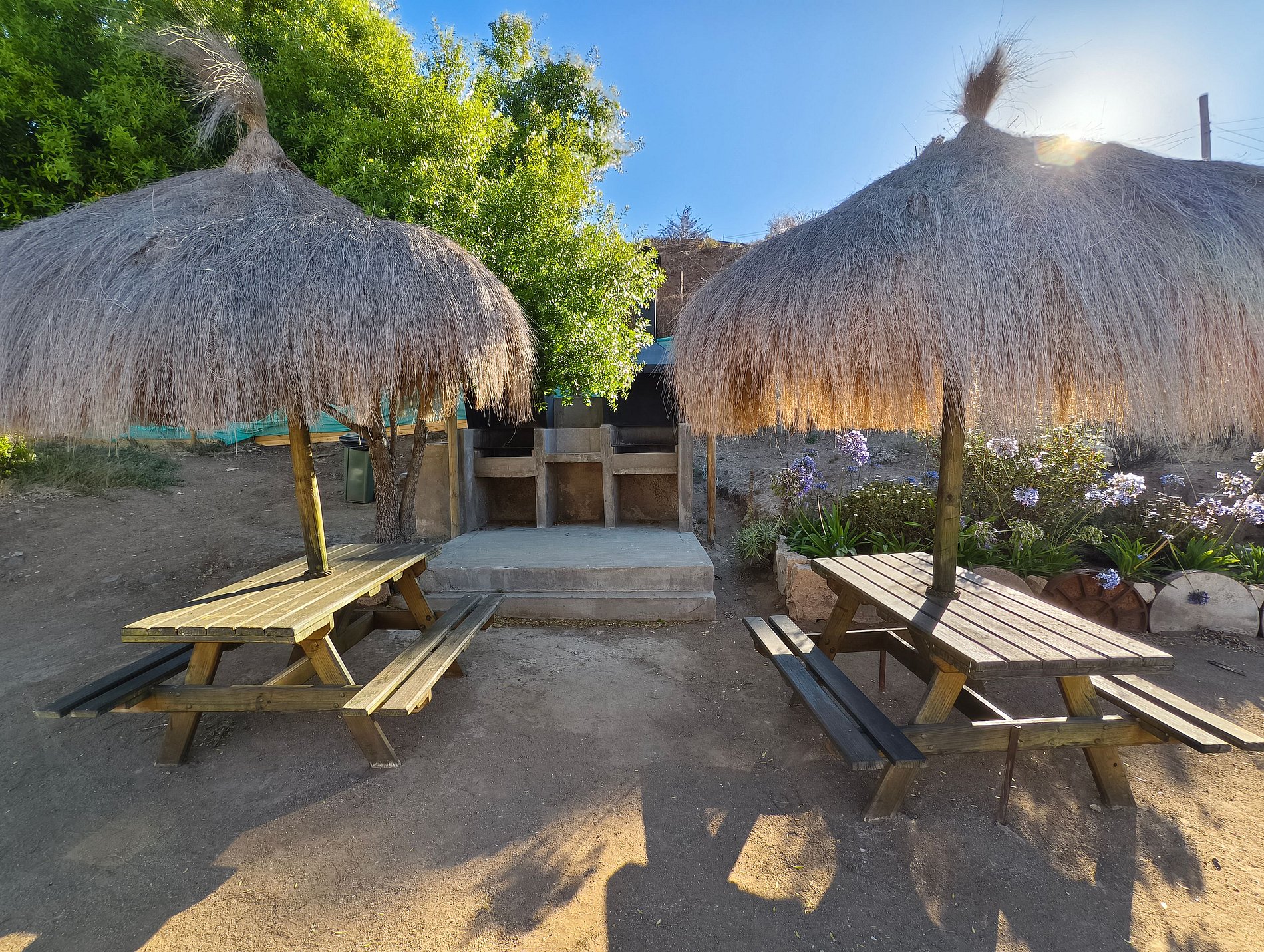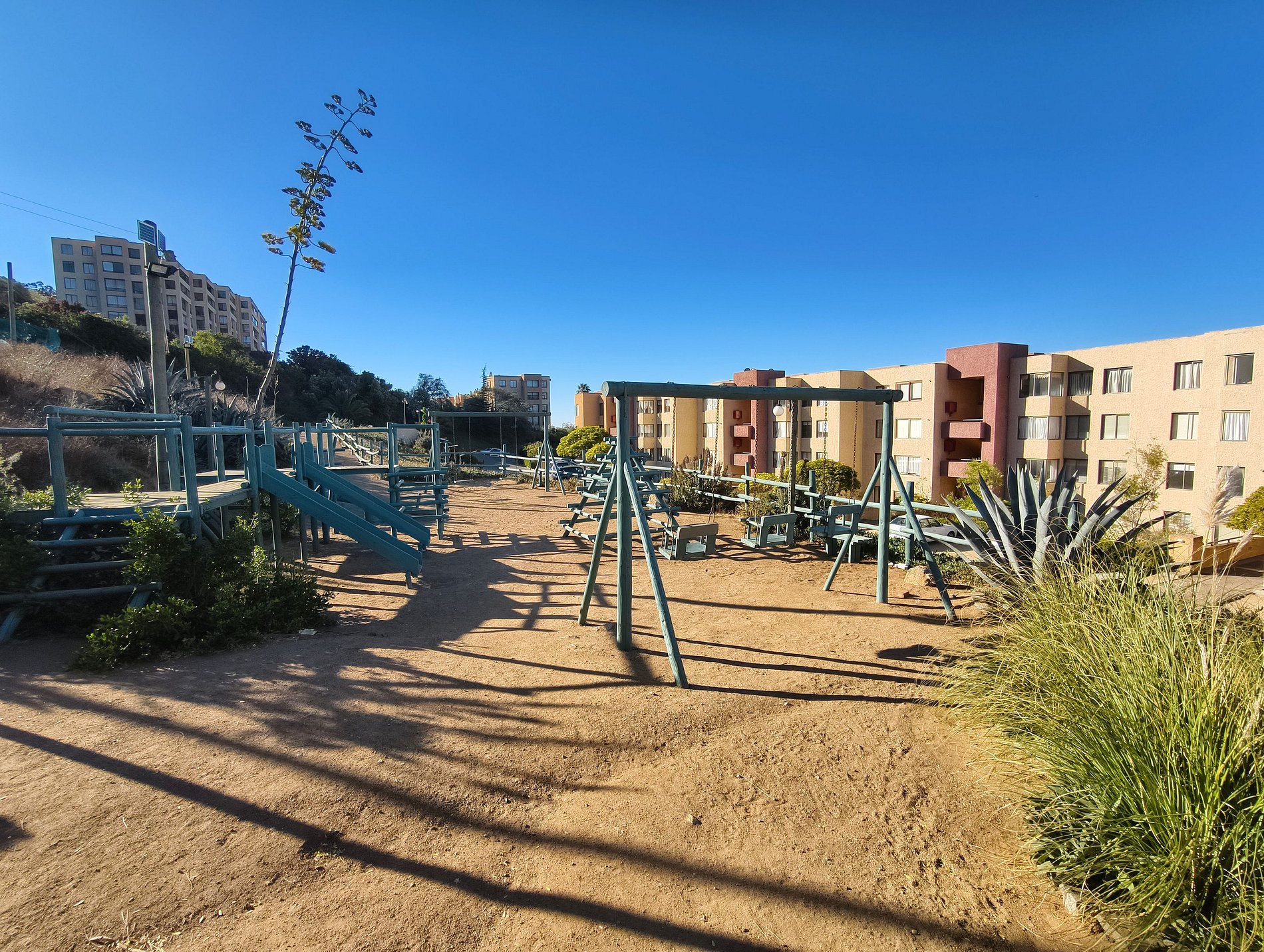 El condominio tiene quinchos, jardines, zona de juegos para niños, piscina y un amplio estacionamiento de visitas. Tiene camino directo a la carretera para conexión directa la ciudad. Los edificios se encuentran en un terreno inclinado, pero los caminos peatonales son planos. Para acceder a los quinchos hay que subir unas escaleras cortas, y para ir a la piscina se bajan varias escaleras.