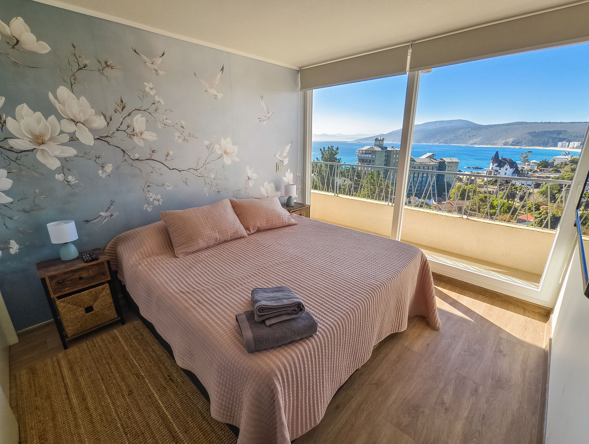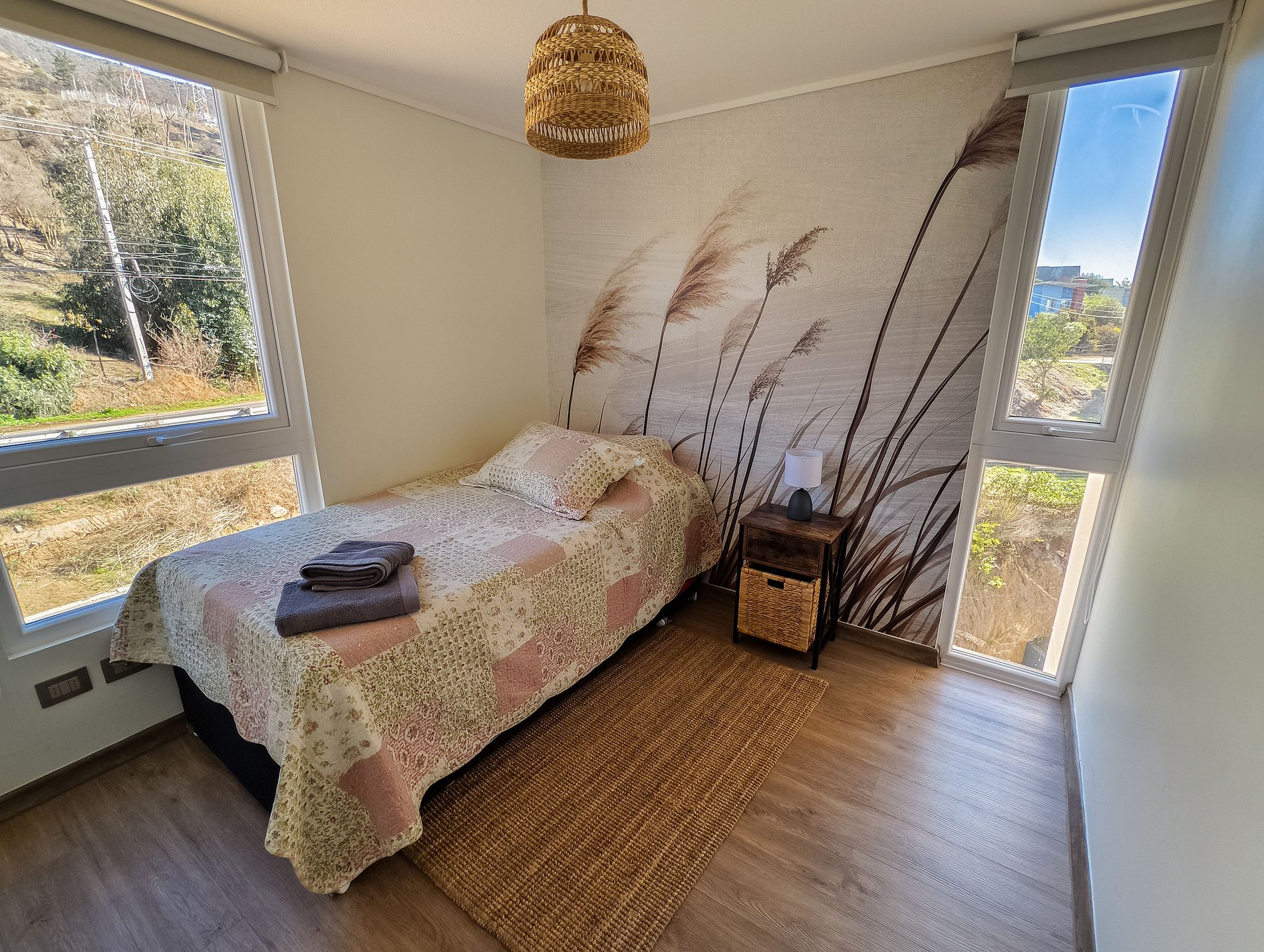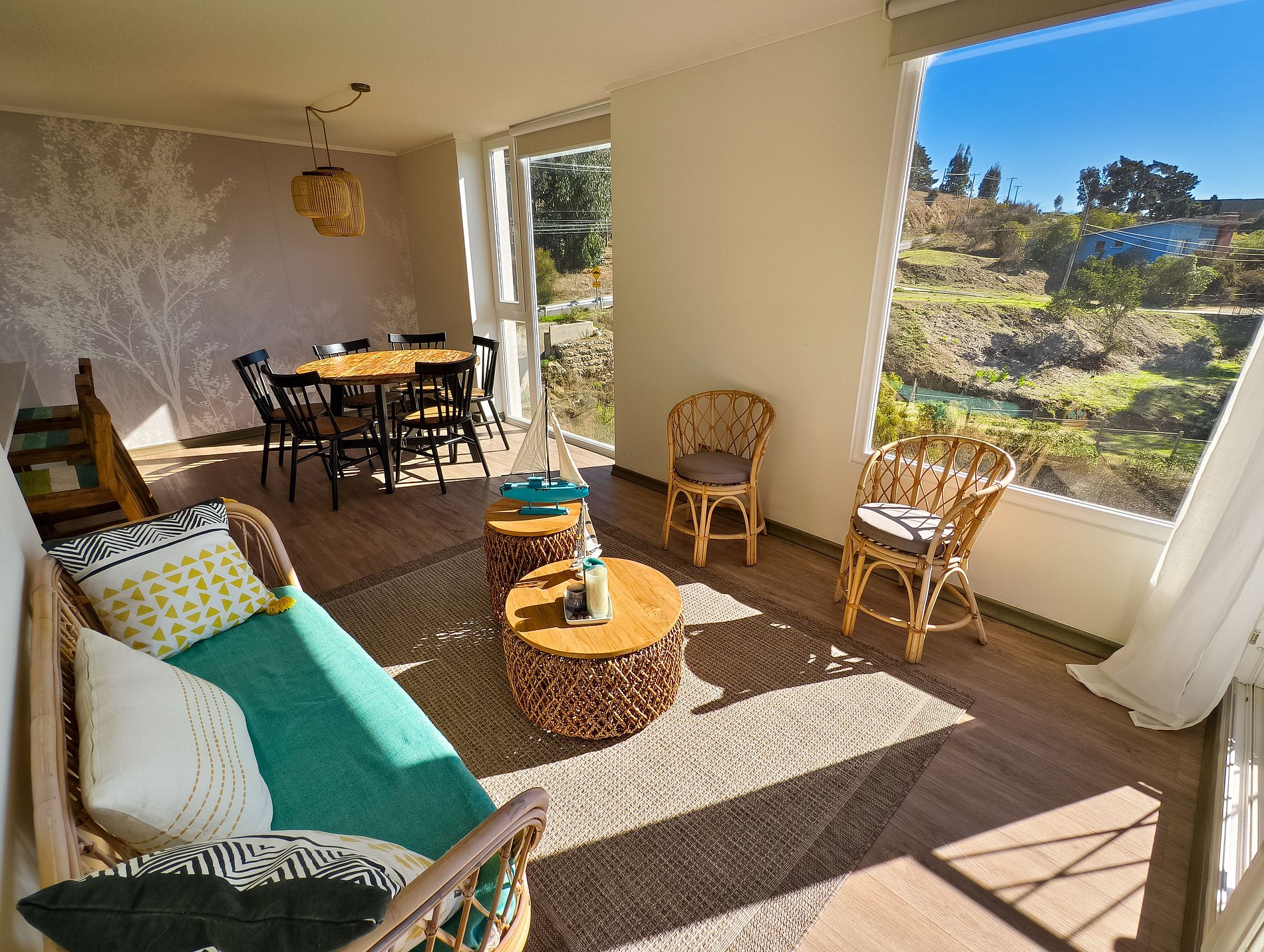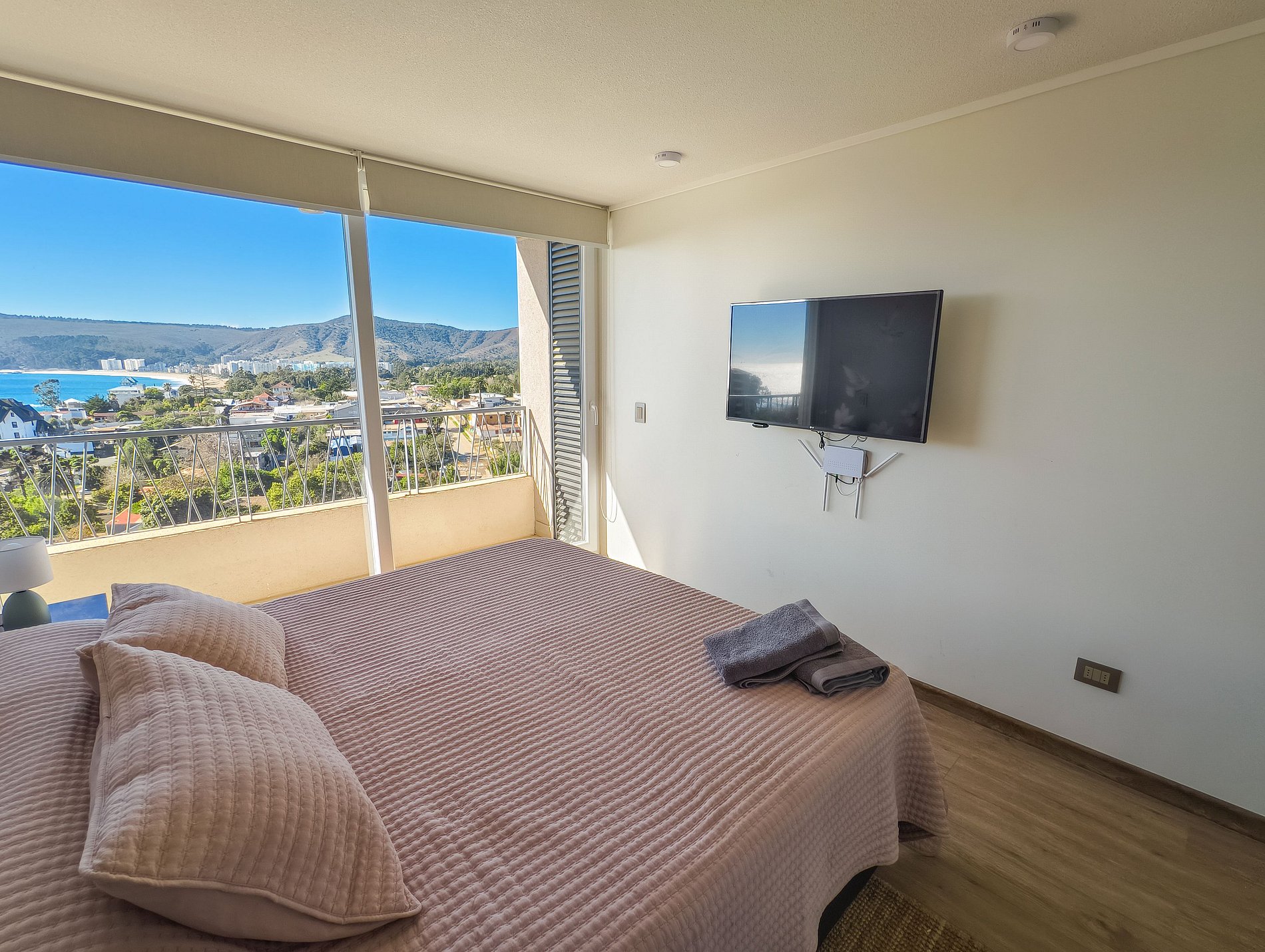 El living cuenta con un sofá para que puedan pasar momentos agradables en familia. El dormitorio matrimonial tiene vista directa a Papudo y cuenta con televisión.