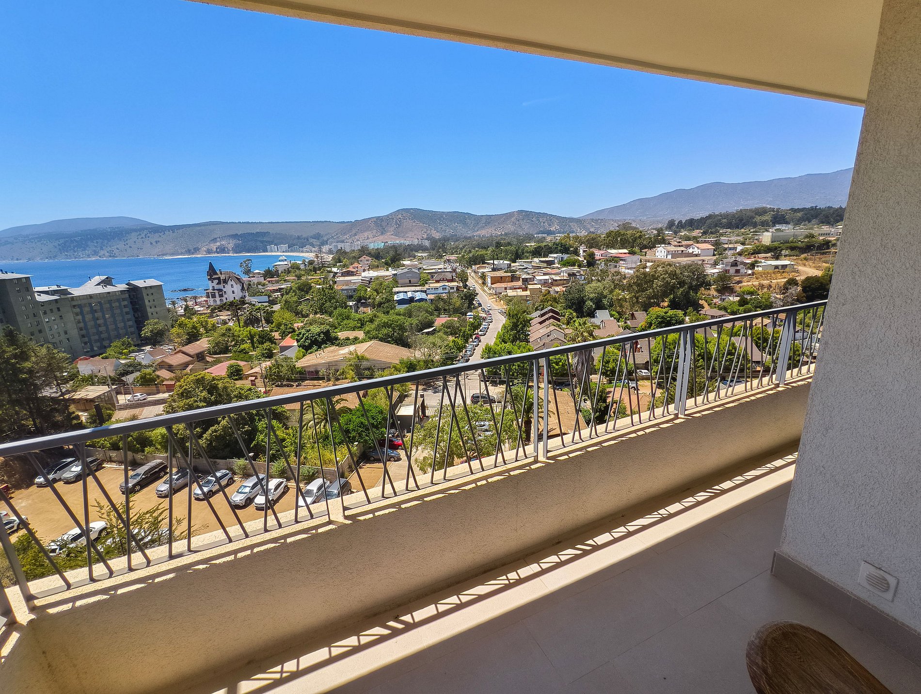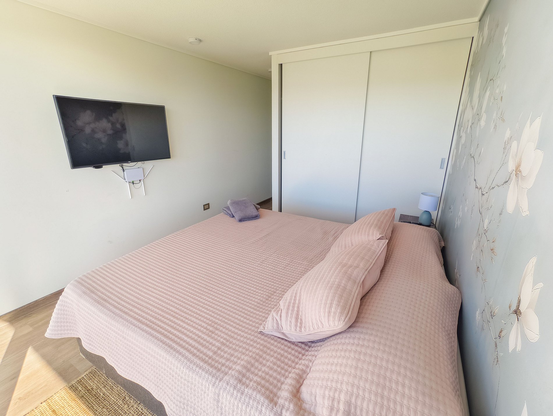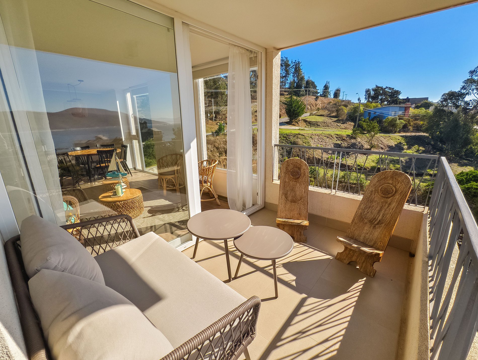 El living cuenta con un sofá para que puedan pasar momentos agradables en familia. El dormitorio matrimonial tiene vista directa a Papudo y cuenta con televisión.