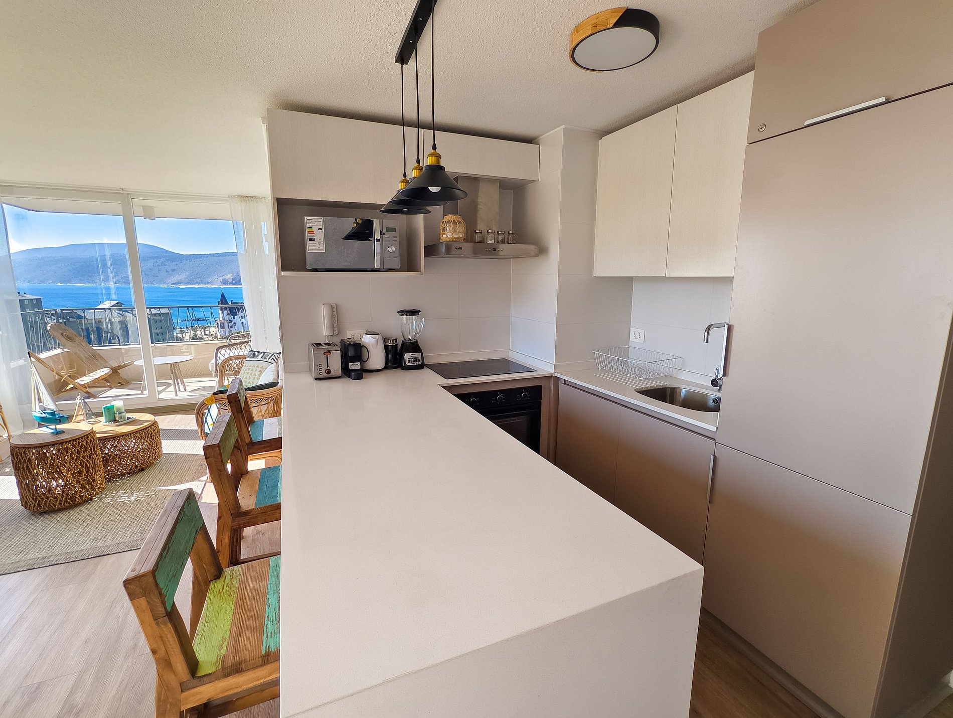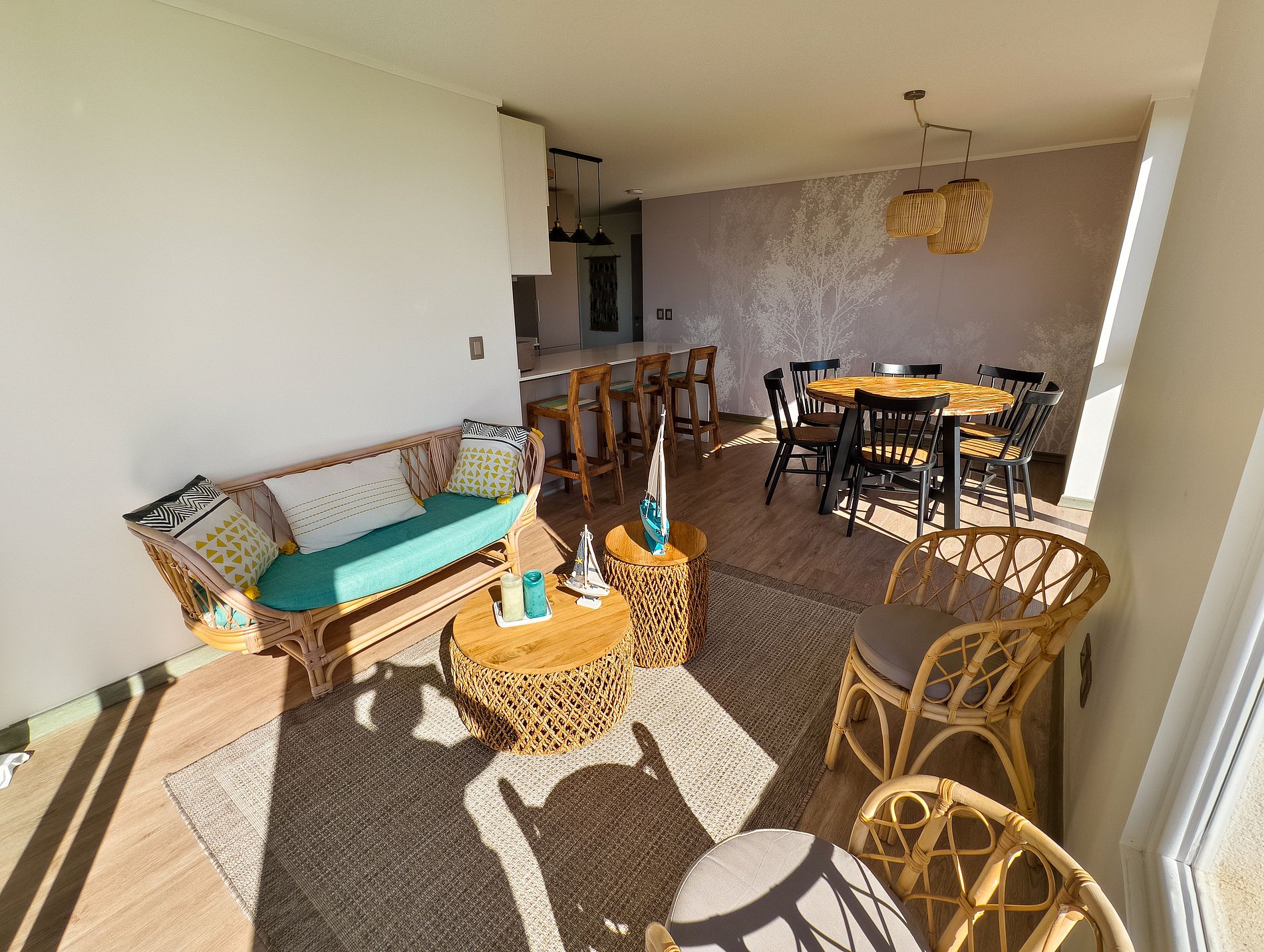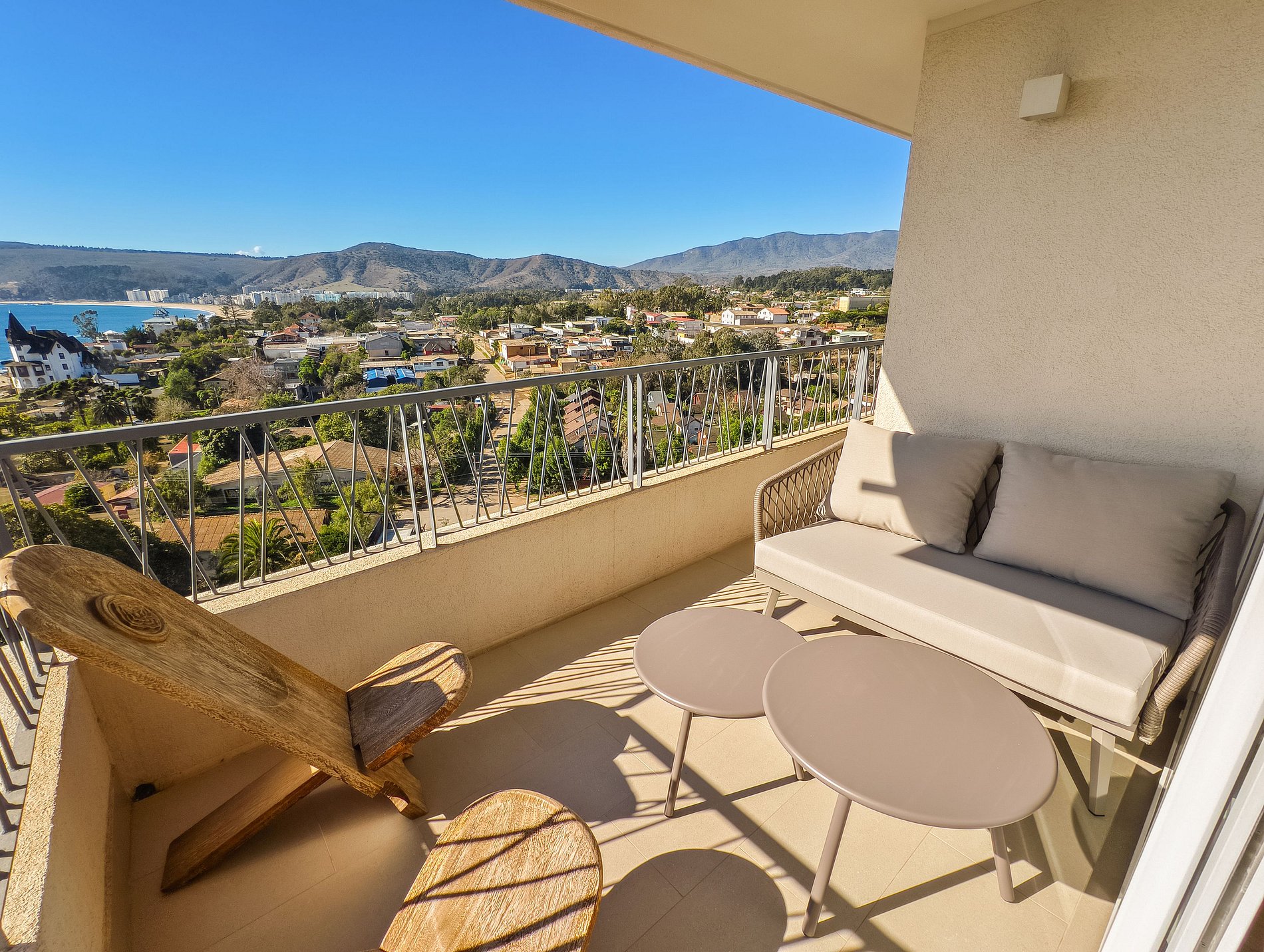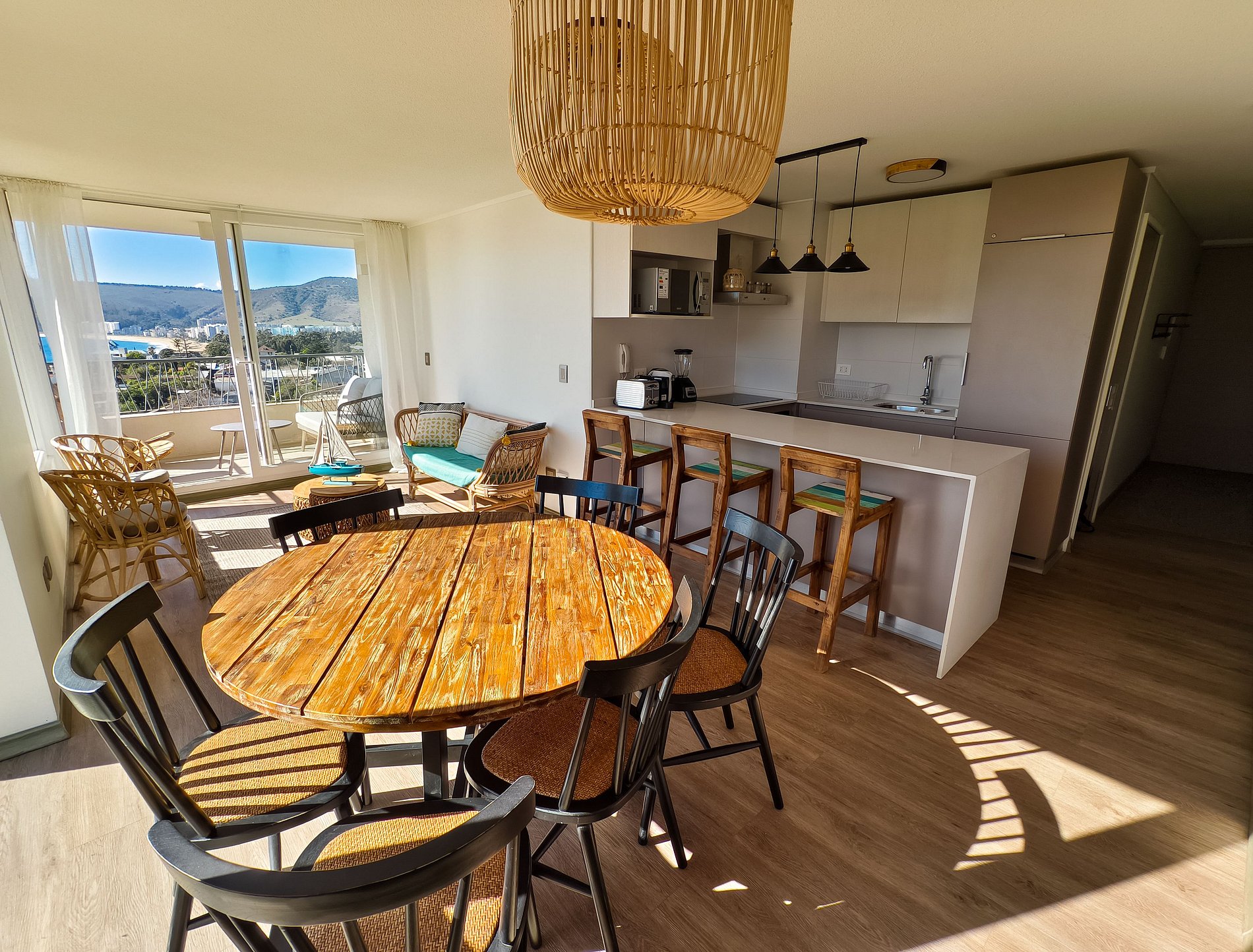 El living cuenta con un sofá para que puedan pasar momentos agradables en familia. El dormitorio matrimonial tiene vista directa a Papudo y cuenta con televisión.