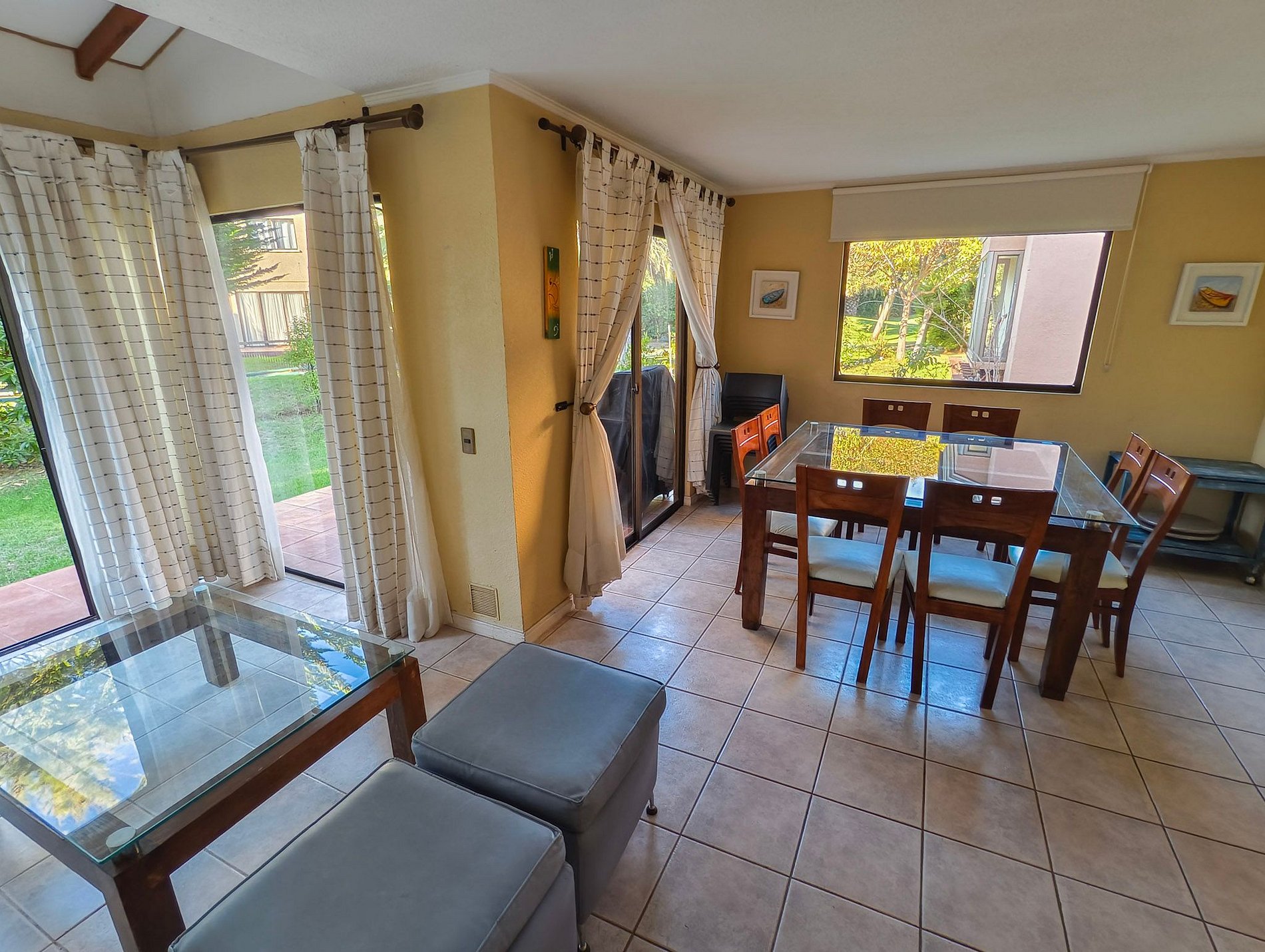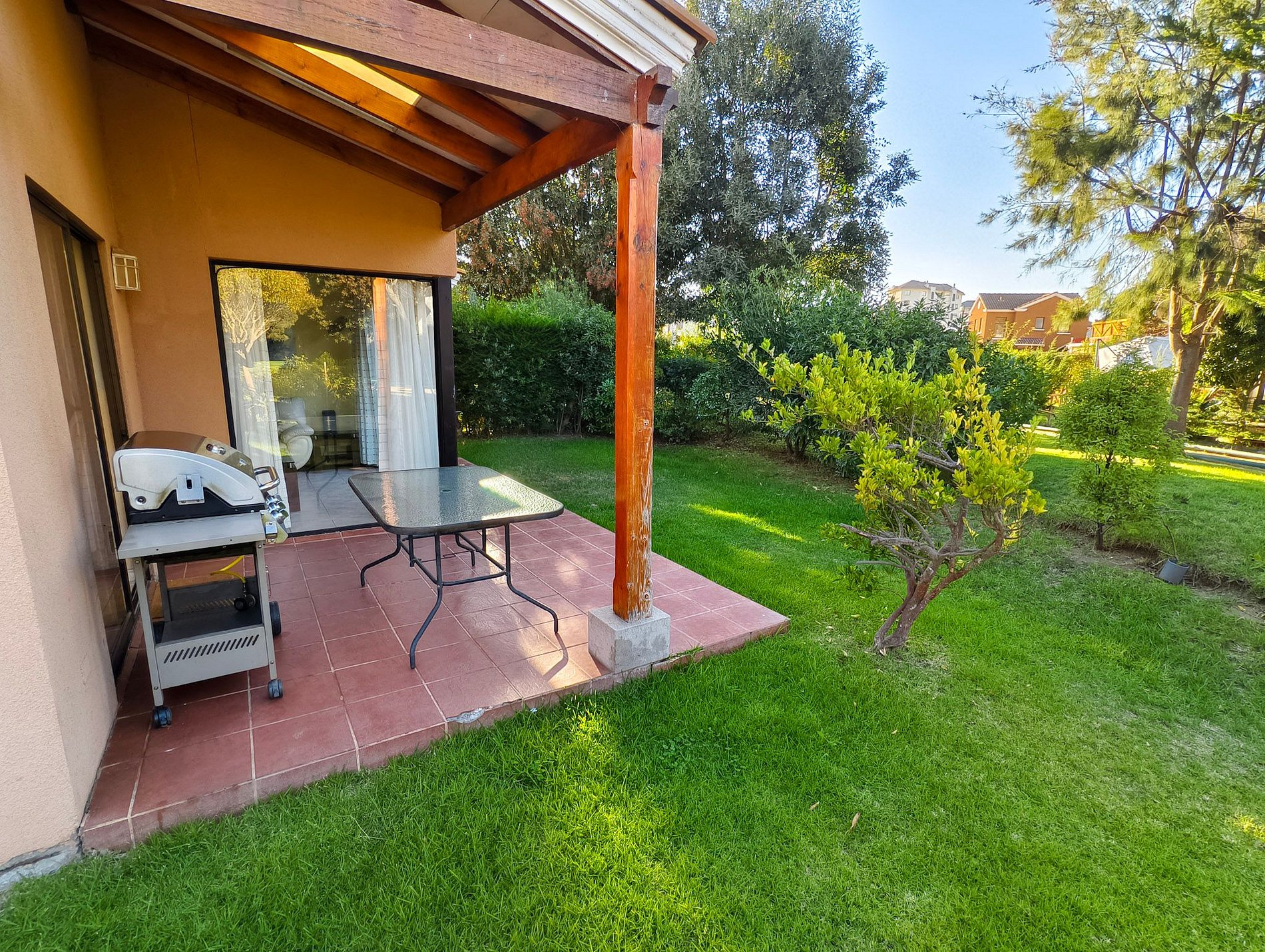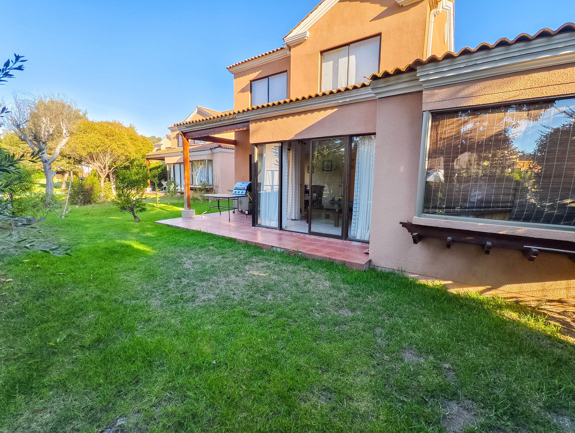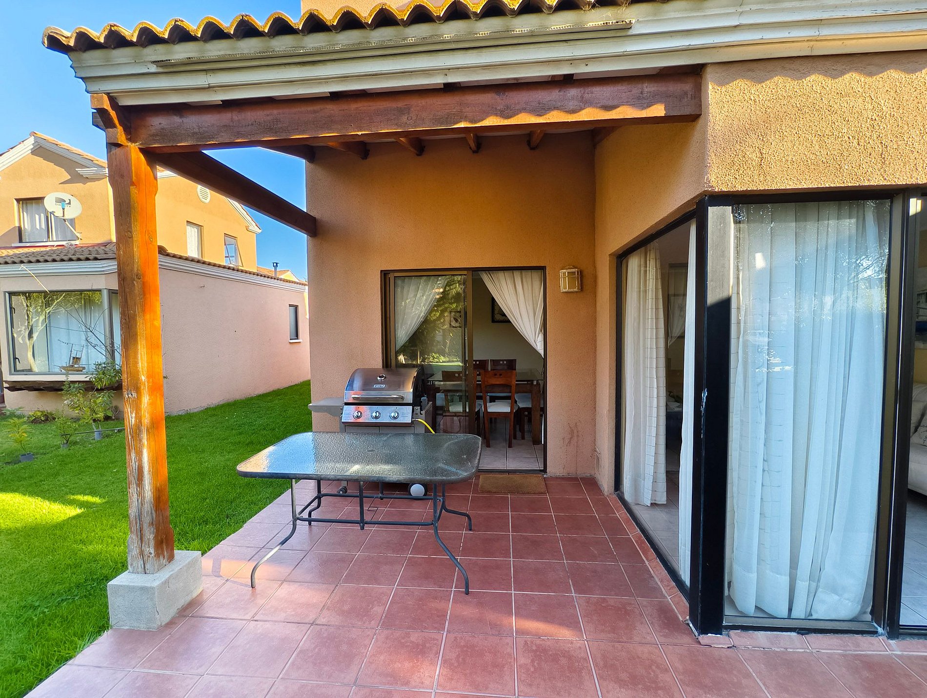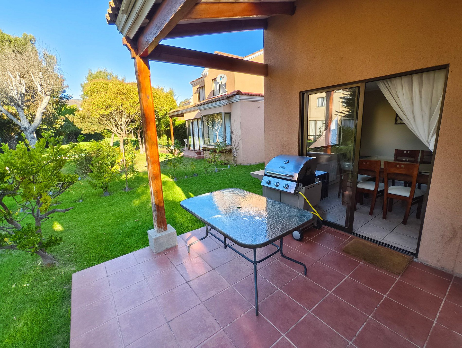 La terraza cuenta con jardín, mesa para compartir y parrilla, también cuenta con televisión en sus habitaciones, exceptuando uno de los dormitorios del segundo piso, y cocina full equipada.
