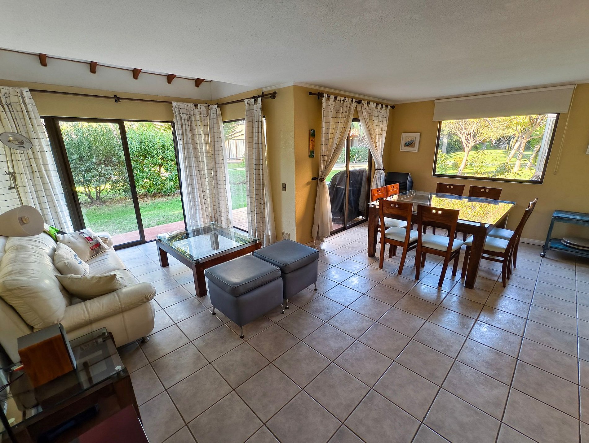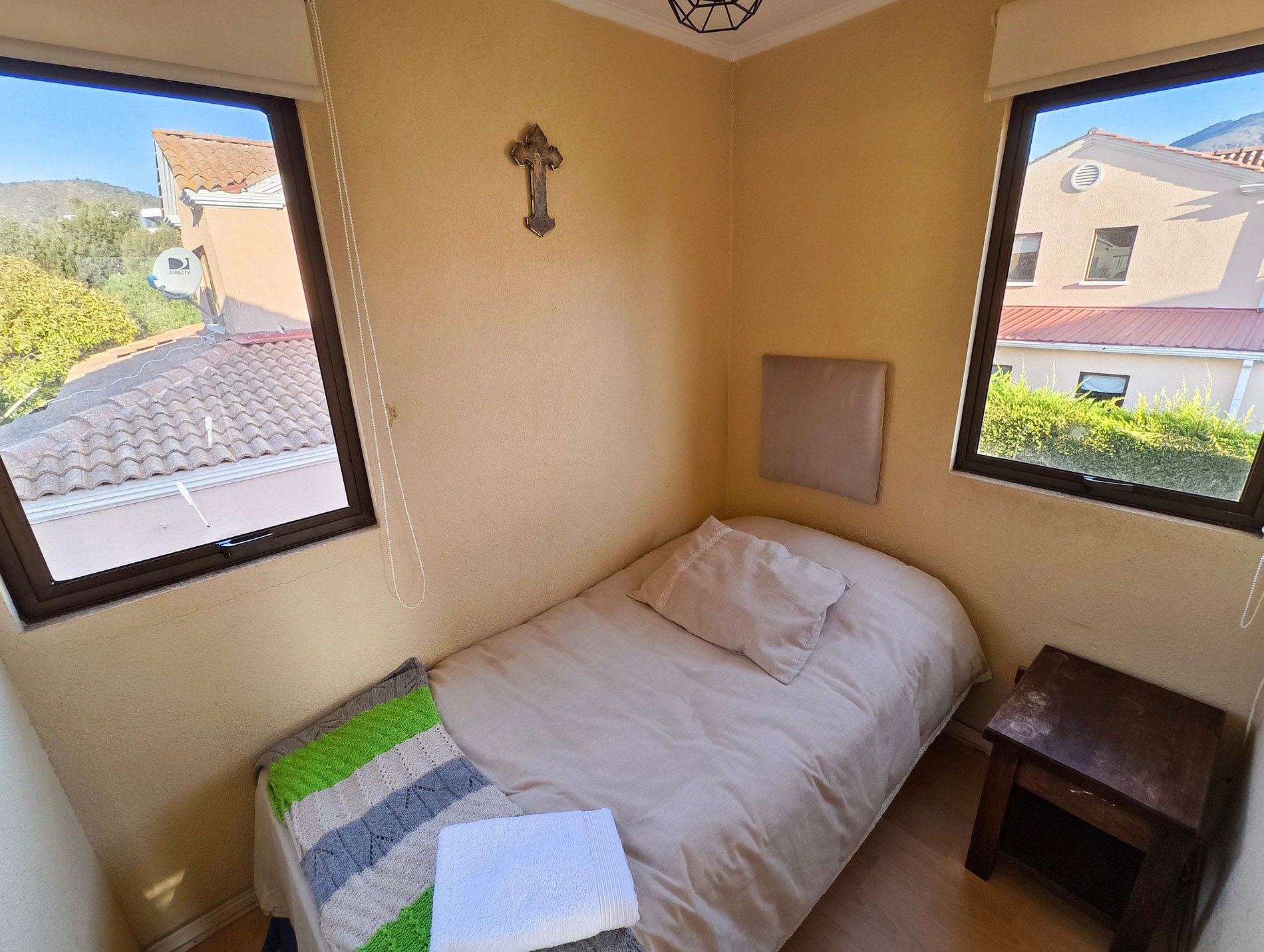La terraza cuenta con jardín, mesa para compartir y parrilla, también cuenta con televisión en sus habitaciones, exceptuando uno de los dormitorios del segundo piso, y cocina full equipada.