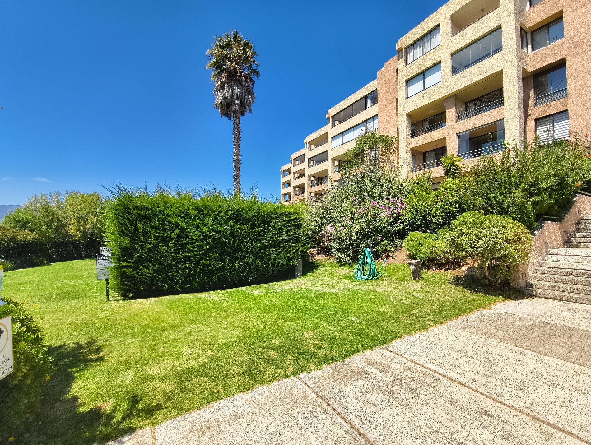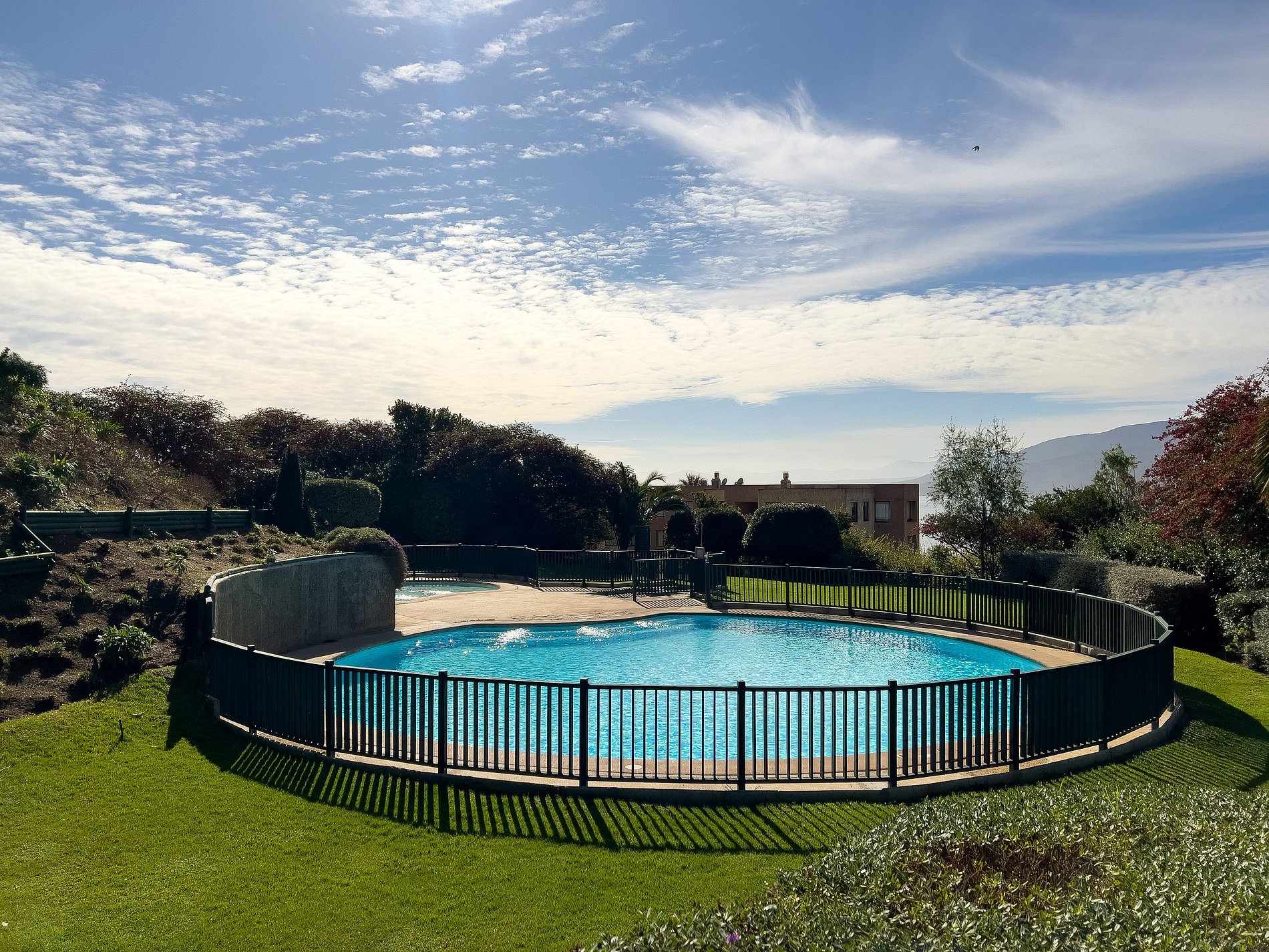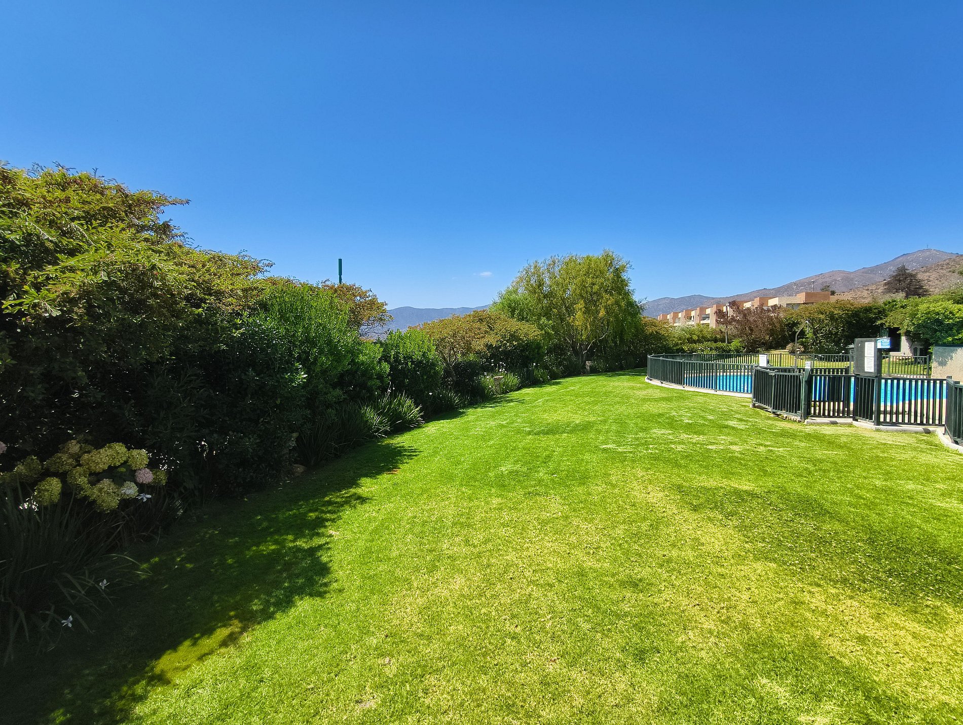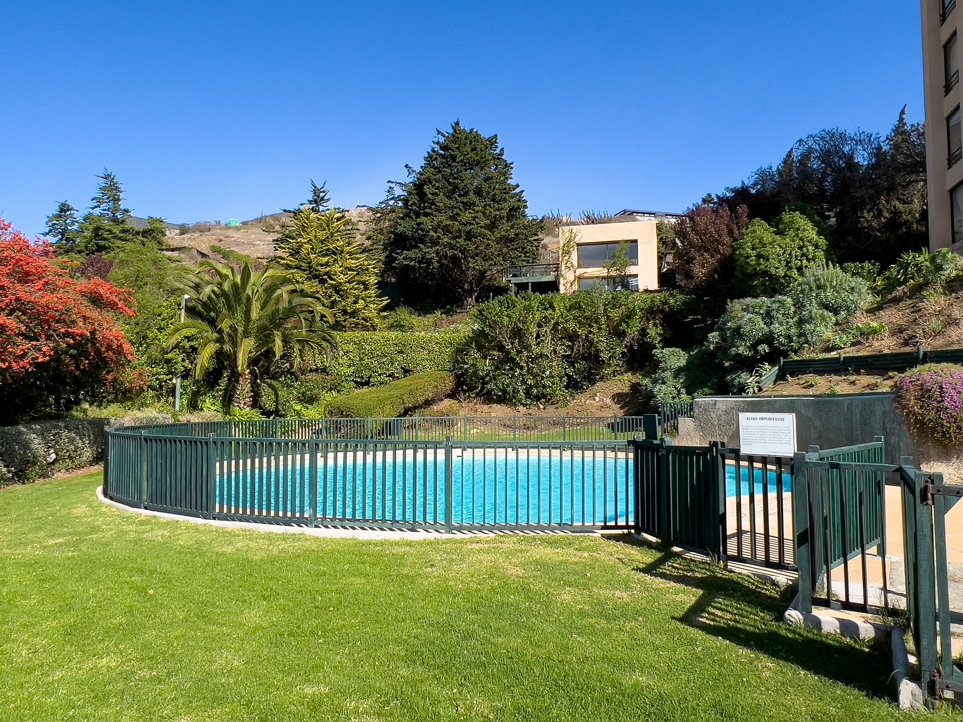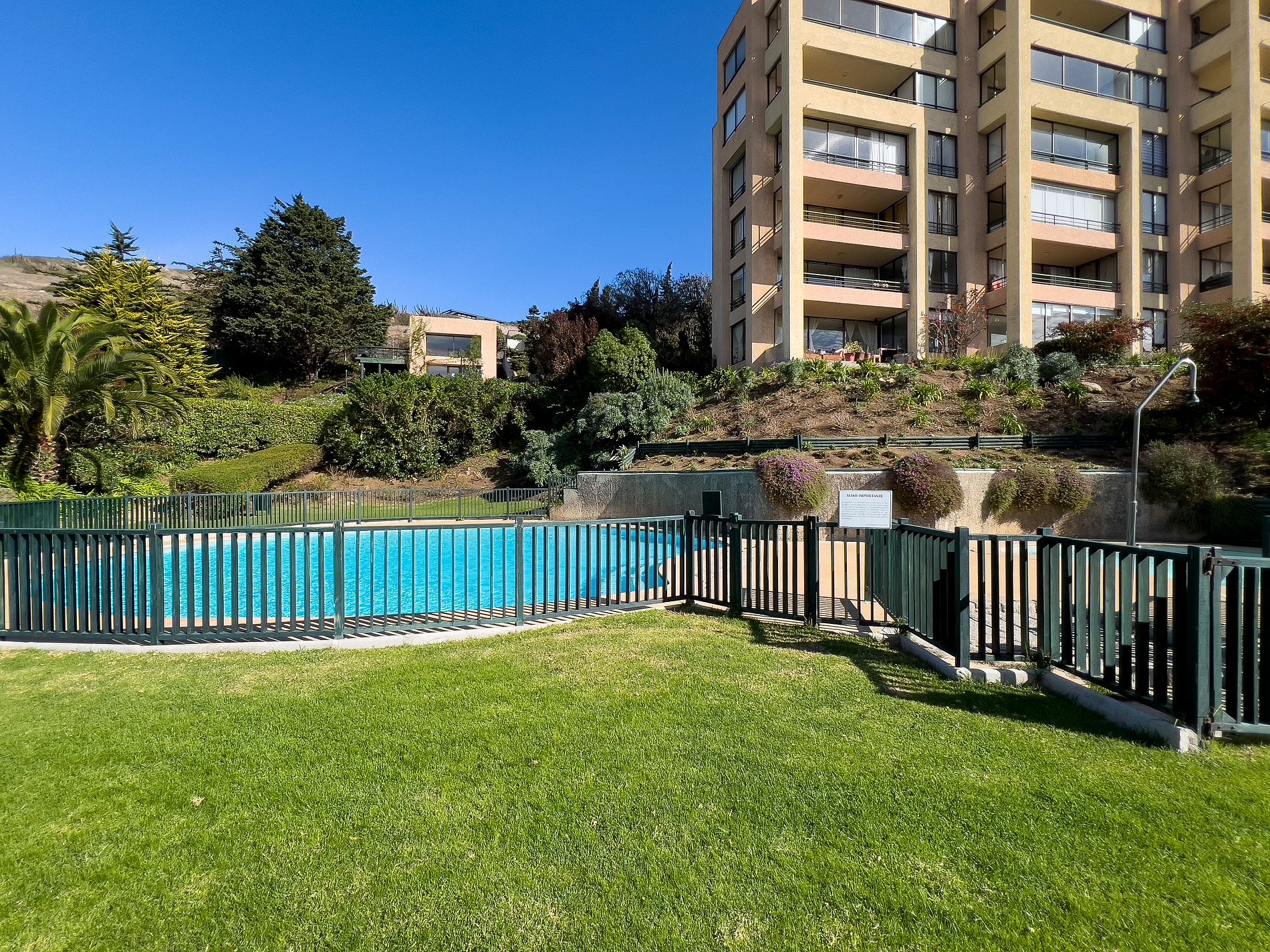La piscina está en medio de estos jardines rodeada de pasto, lo que hacen toda esta zona perfecta para el descanso (la piscina es accesible por escaleras). Aquí se podrá pasear y disfrutar de la tranquilidad. El ambiente es muy silencioso, con excelentes vistas y en un condominio muy tranquilo, alejado de todo el ruido.